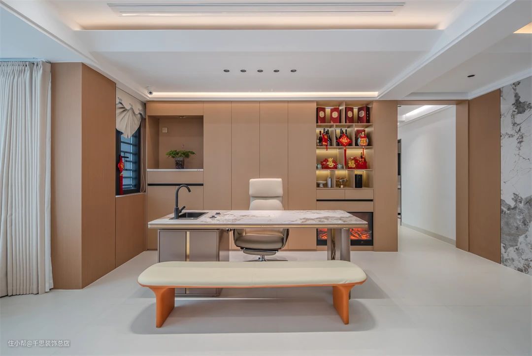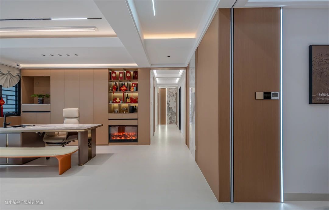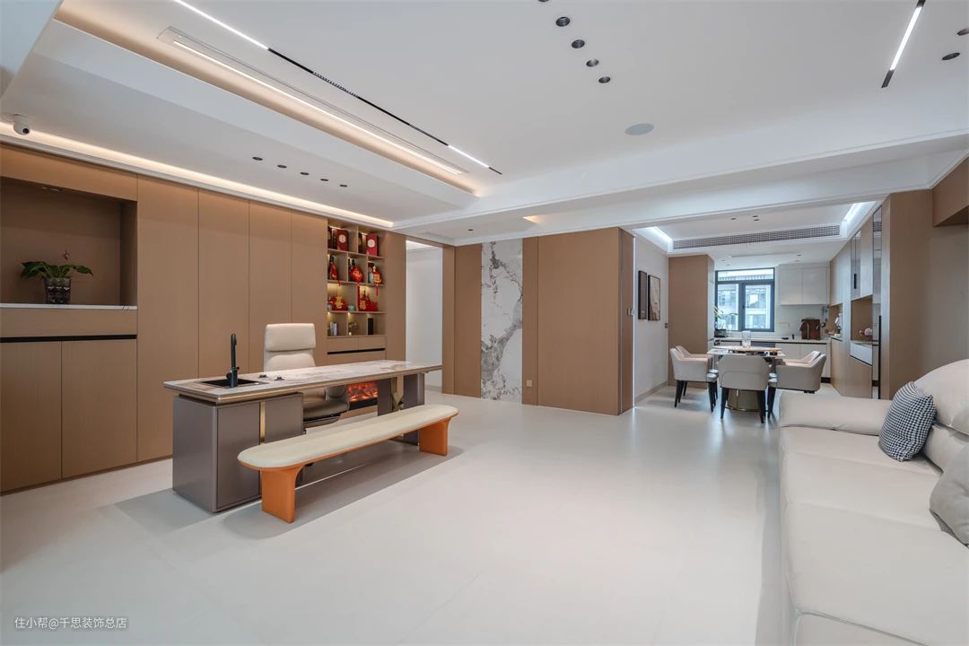 ▲ 此大横厅设计凸显现代原木风格,空间宽敞且灵活多变。书房与客厅融为一体,形成开放式格局,提升居住舒适度,展现出简约与品味来。 米白色沙发与木饰面背景墙相映成趣,岩板修饰增添空间层次感。简约纯粹的设计风格,打造现代舒适家居,尽显高雅品味与精致生活。
