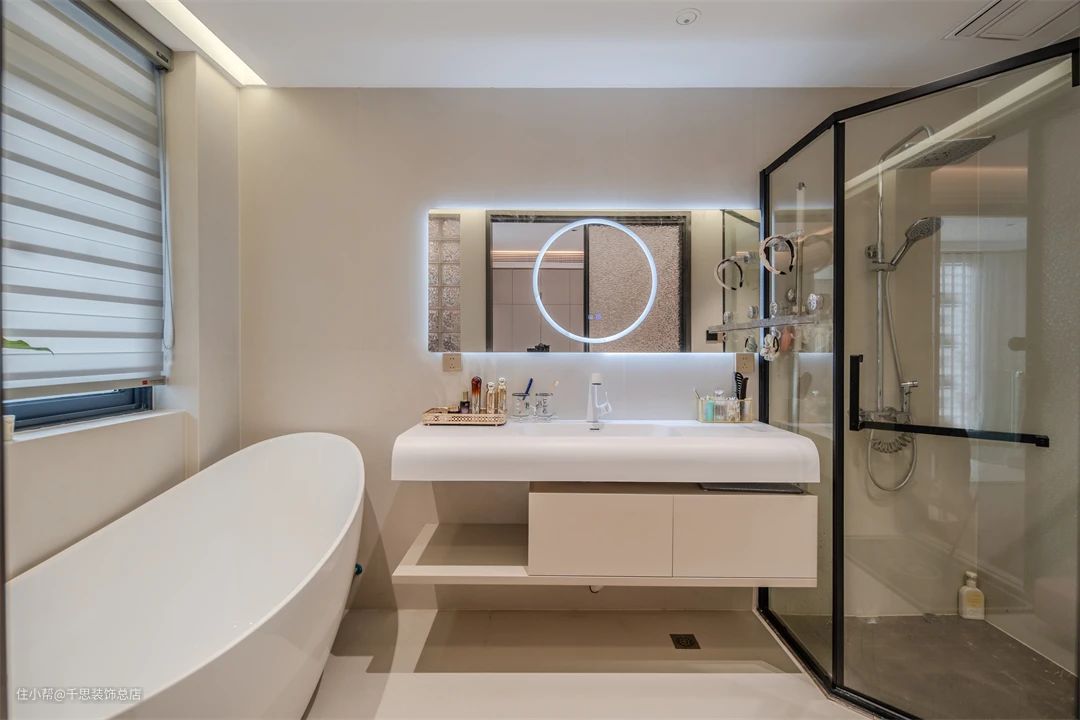 ▲ 主卫空间以浅色系为主,明亮洁净。米色卫浴柜与方形镜柜相得益彰,彰显精致格调,打造出一个既舒适又时尚的私人卫浴空间。