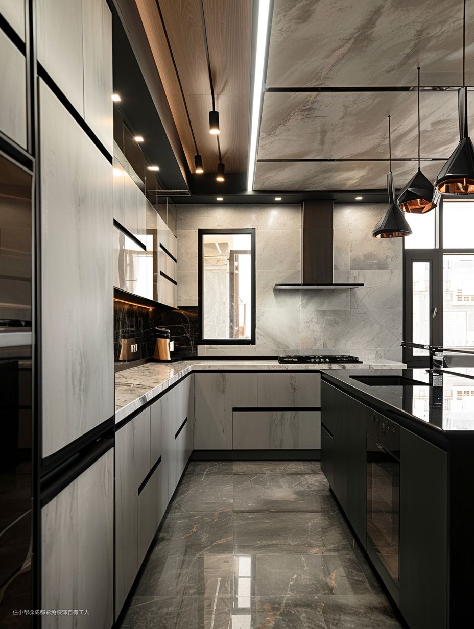 L 形橱柜布局充分利用了厨房空间,提供了充足的操作台面和收纳空间。岛台设计不仅增加了厨房的功能性,还可以作为临时的餐桌或备餐区。吊柜的设置增加了厨房的收纳能力,让厨房更加整洁有序。吊灯为厨房提供了局部的重点照明,让烹饪更加方便。