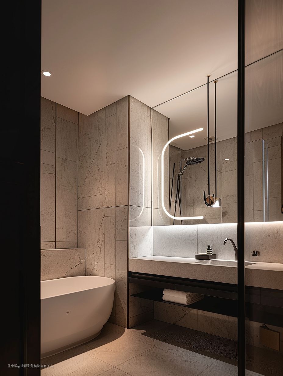 悬空浴柜的设计让卫生间看起来更加简洁大方,同时也方便了日常的清洁打扫。瓷砖铺贴不仅美观,还具有防水防污的功能。浴缸的摆放让主人可以在这里尽情享受泡澡的舒适时光。