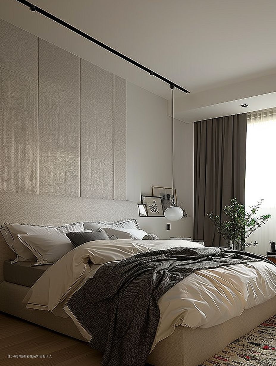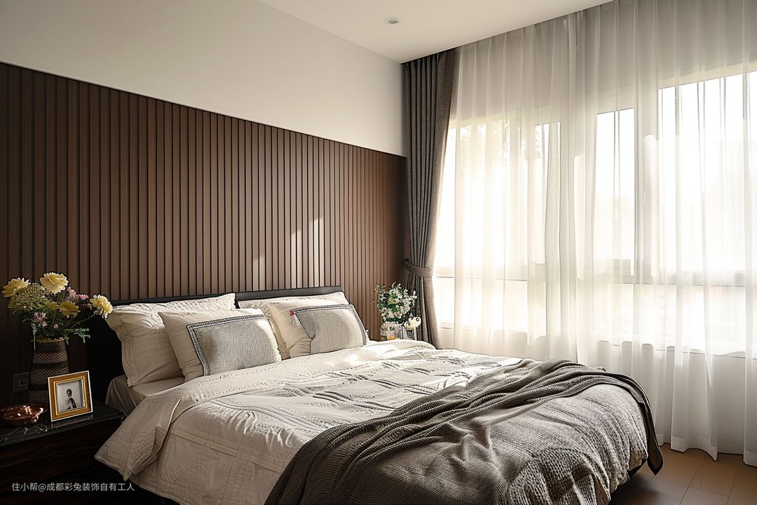 白色纱帘和浅灰色窗帘的搭配,既保证了卧室的采光,又能营造出浪漫而温馨的氛围。床头的花瓶绿植为卧室增添了生机与清新。木地板让卧室更加舒适温暖,仿佛踩在大自然的怀抱中。