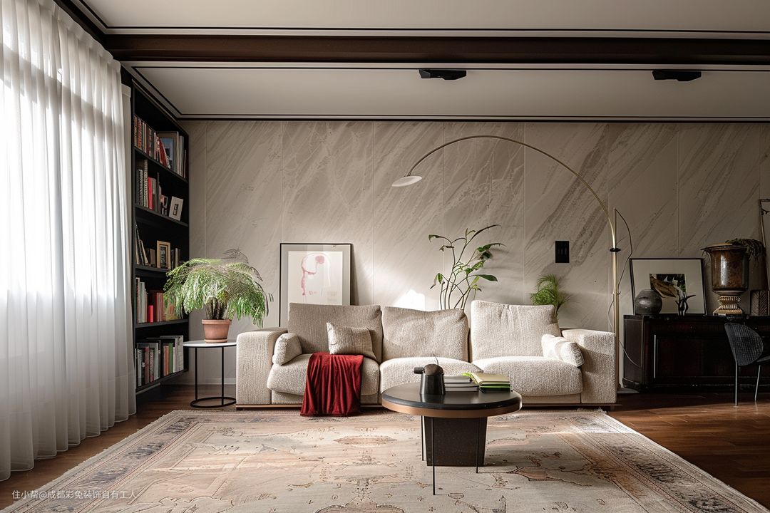 一字沙发靠墙摆放,给予空间一种简洁而稳定的感觉,让人可以舒适地倚靠休息。无主灯设计通过分散的灯光布局,打造出柔和而均匀的光线环境,更显温馨与高级。开放式书柜不仅增加了收纳和展示功能,还让客厅更具文化氛围。木地板则为整个空间增添了自然温暖的质感。圆形茶几以其圆润的线条打破了空间的规整感,带来一丝活泼气息