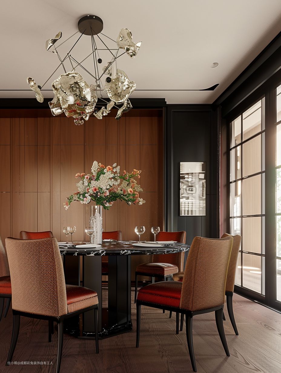 木地板延续了客厅的温暖质感,让餐厅与客厅在风格上保持一致。花瓶绿植为餐厅带来了生机与活力,增添了自然的气息。个性吊灯成为餐厅的视觉焦点,独特的造型让用餐氛围更加时尚浪漫。餐桌和餐椅的搭配简洁大方,满足日常用餐需求的同时,也提升了空间的美感。