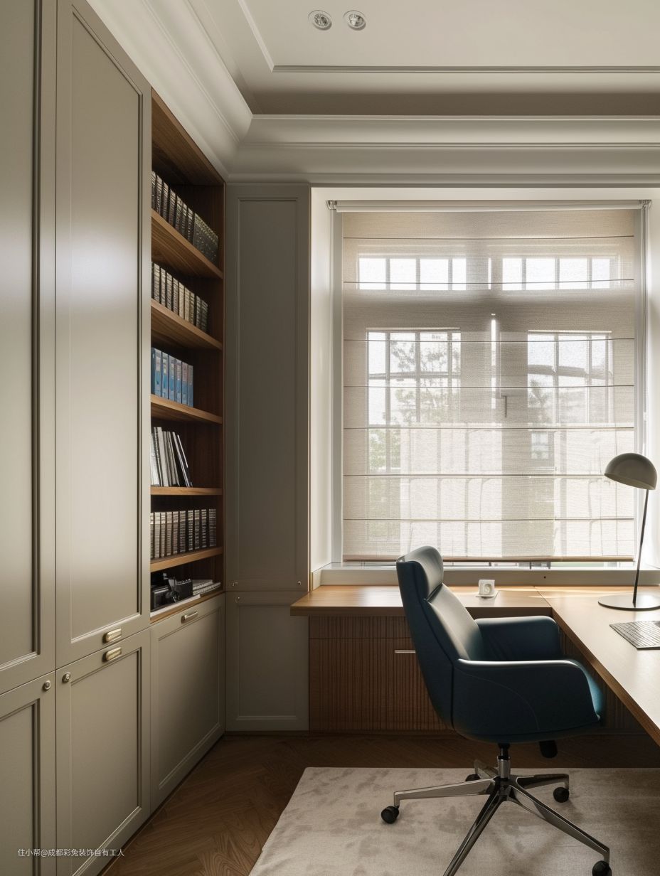 定制 L 型书桌充分利用了空间,提供了宽敞的工作学习区域。台灯为阅读和工作提供了充足的光线。内嵌式书柜增加了收纳空间,同时也让书房更具整体性。木地板让书房更加安静舒适。