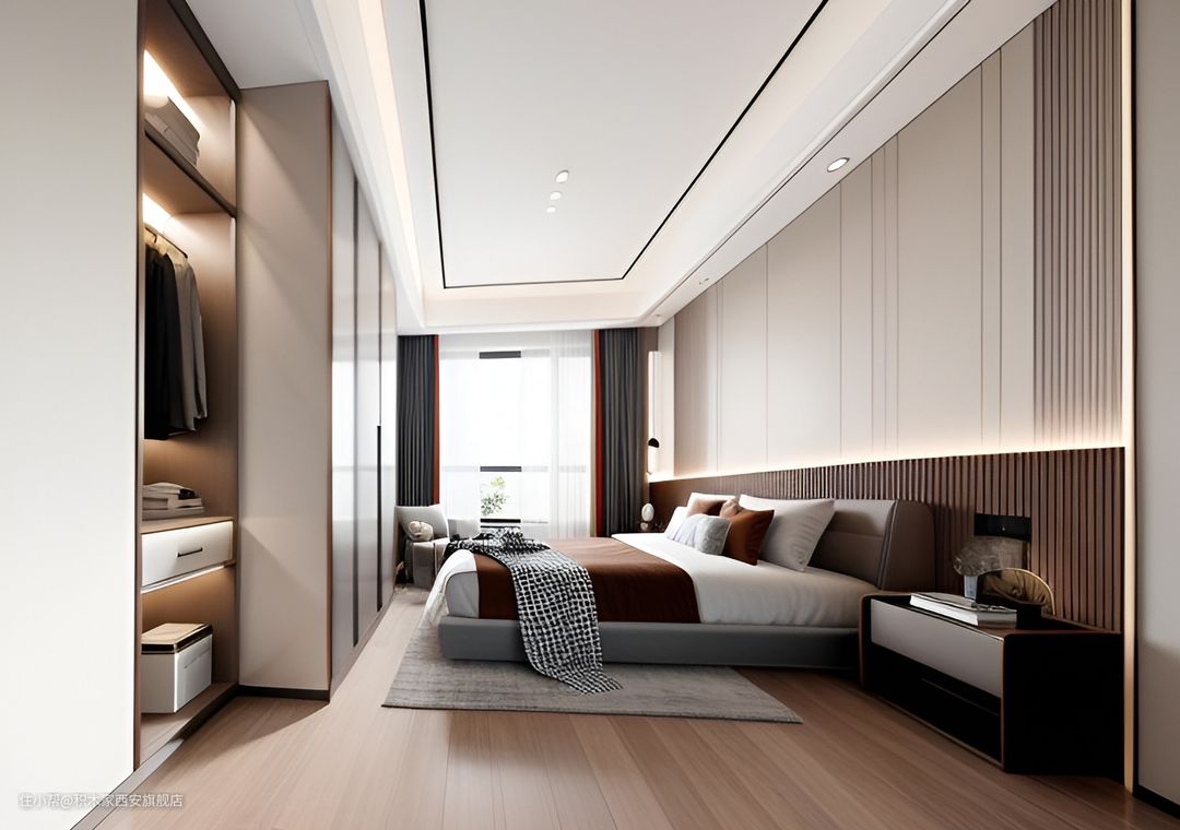 步入这个卧室,一股温馨而雅致的气息扑面而来。首先吸引眼球的是那张宽敞舒适的床铺,洁白无瑕的被褥上点缀着深棕色的抱枕,仿佛在无声地邀请你躺下休息片刻。床头背景墙采用浅色木纹材质打造,两侧分别设有壁灯,柔和的光线洒满整个房间,营造出宁静舒适的睡眠环境。 左侧是一个开放式衣橱,衣物整齐地悬挂其中,方便取用且易于整理。右侧则是另一侧墙壁上的衣柜,同样拥有充足的储物空间。地板选用原木色系强化木地板铺设,自然纹理尽显其中,与整体色调和谐统一。床尾处放置了一个黑色边柜,上面摆着一个台灯和一些装饰品,为房间增添了几分艺术气息。 窗户前是一张单人沙发椅,旁边还有一盆绿植陪伴,无论是阅读还是小憩都是绝佳选择。窗帘使用了白色纱质材料,并配以橙红色条纹装饰,既保证了私密性又能引入适量阳光。天花板上嵌入式灯具提供了充足照明,而四周环绕的暗藏灯带则在夜晚时分创造出浪漫氛围。