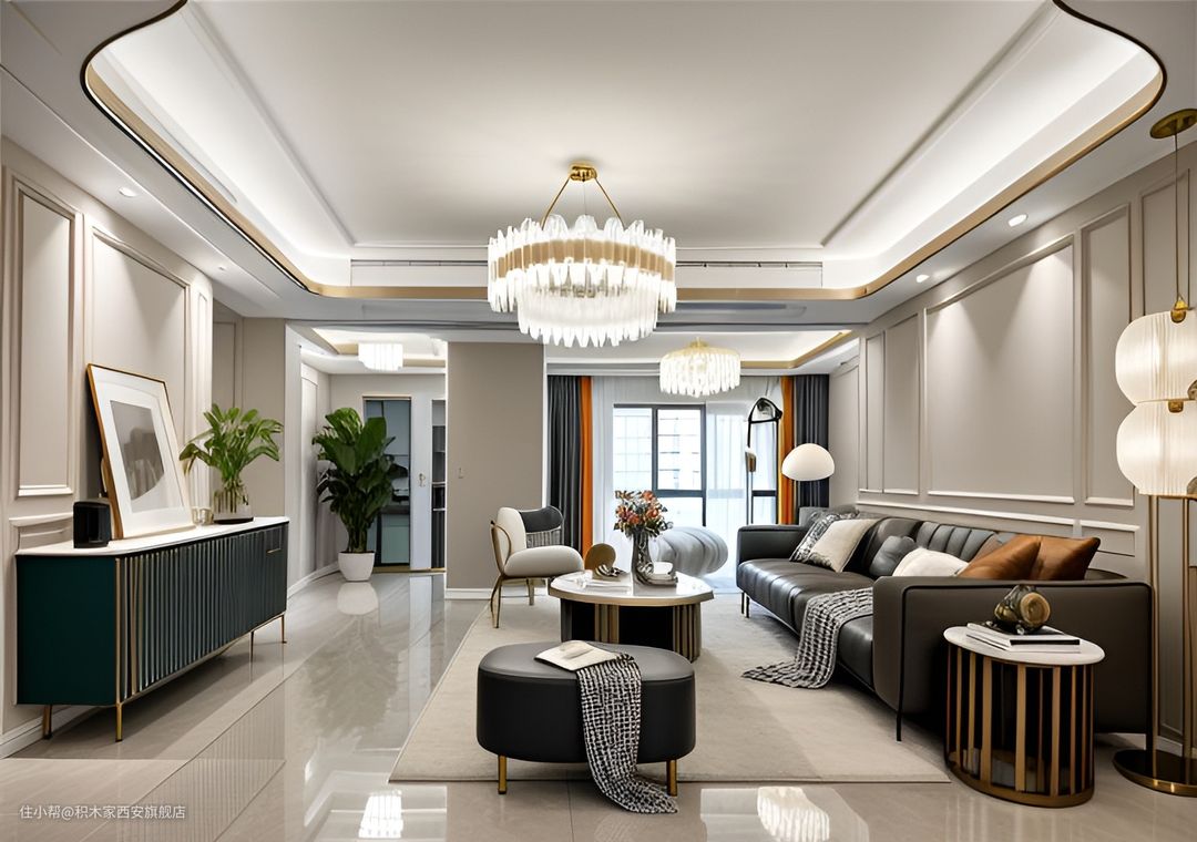 在这个精心设计的空间里,每一个细节都体现了设计师对品质生活的追求。 首先映入眼帘的是那盏华丽的吊灯,它悬挂在中央,散发出柔和而温暖的光芒,为整个房间增添了一抹奢华的气息。沙发和茶几则采用了简约的设计风格,线条流畅、造型简洁,既实用又美观。此外,还有各种精致的小摆设点缀其中,如花瓶、书籍等,它们不仅起到了装饰作用,还为空间注入了生活的情趣。 除了家具之外,色彩搭配也是这个客厅的一大亮点。米色墙面与灰色地砖相互衬托,营造出一种宁静舒适的氛围;金色元素则巧妙地点缀在各个角落,提升了整体格调。同时,绿色植物和鲜花也被巧妙地融入到布置中,为原本冷色调的空间带来了生机与活力。