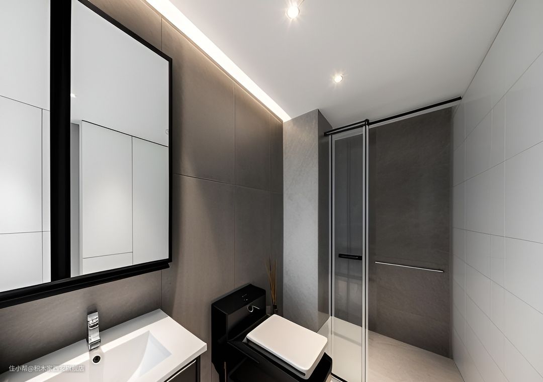 现代感的卫生间设计,采用了黑白灰三色为主调。洗手台上方的大镜子增强了空间感,同时也方便使用者整理仪容。马桶旁的淋浴区由透明玻璃隔断开来,保持了视觉上的开阔性。墙面和地面均铺设了灰色瓷砖,给人一种沉稳大气的感觉。此外,浴室柜和马桶也都选择了简约风格的设计,与整体氛围相得益彰。顶部的隐藏式灯光提供了柔和的照明效果。整个空间布局紧凑而不局促,细节处理到位,体现了设计师对生活品质的追求。
