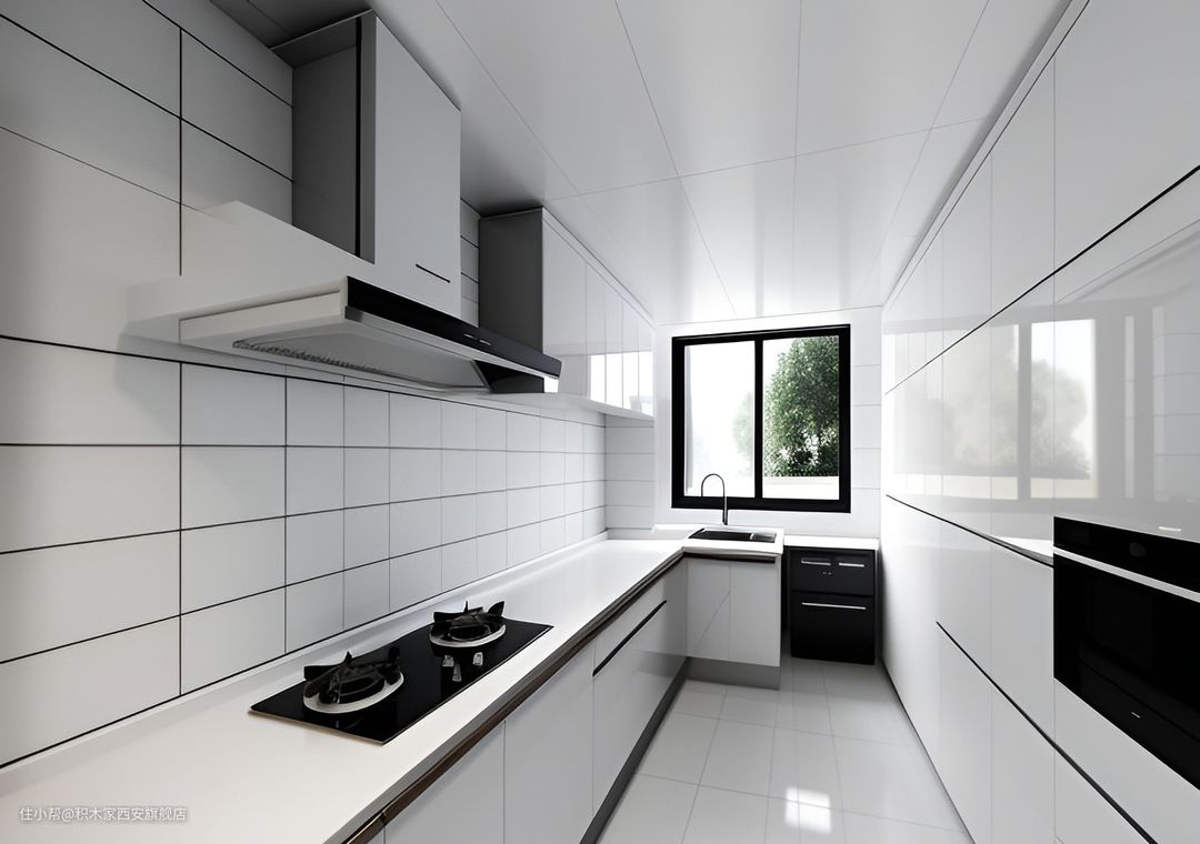 走进这个厨房,你会立刻感受到一种干净利落的气息。白色的橱柜和瓷砖墙面反射着柔和的光线,使整个空间明亮而通透。操作台上没有任何杂物,只留下一个水龙头和炉灶等待主人烹饪美食。L形布局充分利用了角落位置,增加了存储空间的同时也便于动线规划。窗户前摆放着一台洗碗机和烤箱,方便清洁餐具和烘焙甜点。天花板上装有集成吊顶,确保了良好的通风效果。这里的一切都被精心安排得井然有序,让你在烹饪过程中享受到舒适便捷的感觉。