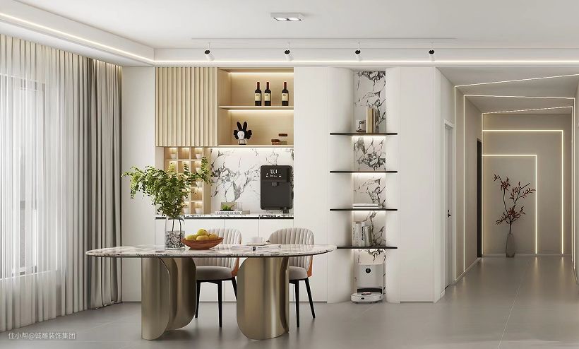 现代感满满的长方形餐桌,颜值高又好打理,餐边柜主要配色就是奶油白和木纹色,无拉手柜门加封闭柜与开放层板柜结合,疏密有致,合理收纳,加上嵌入暖光灯带营造温馨的用餐氛围