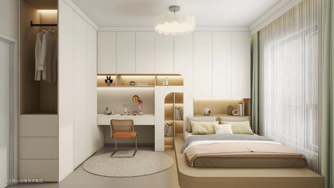 主卧没有选择传统的床+衣柜设计,而是设计了地台床,它相对于传统床可以节约很多空间,延伸到窗户,视觉延伸同时会让整个卧室空间显得更大,床头连接地台打造整面通顶柜收纳充足,梳妆台一体式设计让将空间收纳发挥到极致