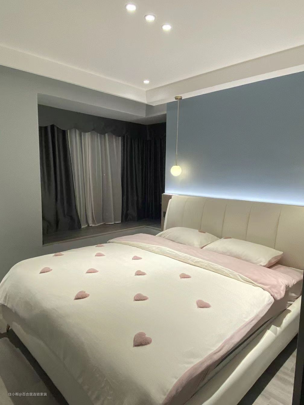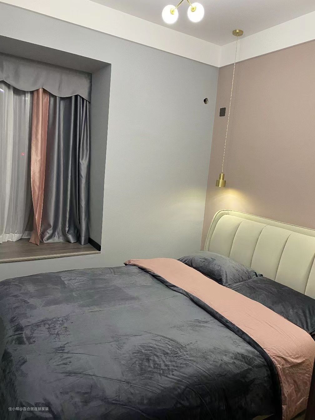 吊灯与壁灯的柔和光线,如同夜空中的星光,为疲惫的身心带来宁静的慰藉。飘窗设计,不仅为房间增添了一抹浪漫,更让窗纱窗帘在微风中轻轻摇曳,仿佛在诉说着家的温柔。粉色系纯色乳胶漆背景墙,如同少女的梦境,温柔而纯净,为这个小小的空间注入了大大的能量。