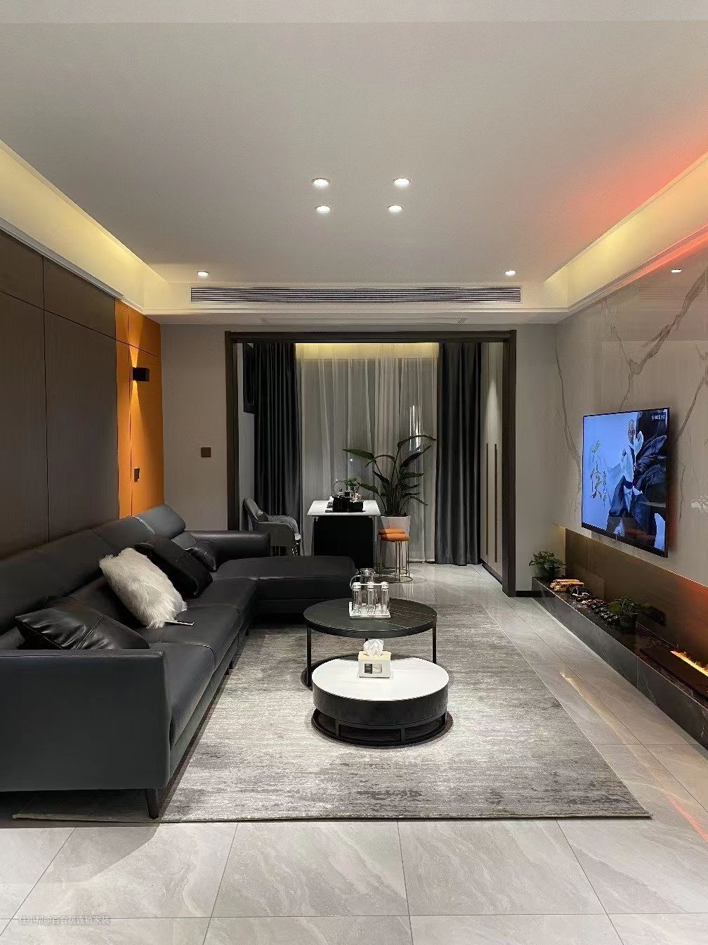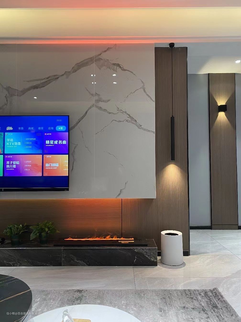 设计师选择了亮光砖正字型铺设地面,不仅因为它的现代感,更因为它易于清洁,让家的主人不必为日常的打扫烦恼。筒灯、线性灯与射灯的巧妙组合,如同星辰点缀夜空,为家的每一个角落带来恰到好处的光亮。沙发背景墙上的拼接色乳胶漆,在射灯的映照下,仿佛讲述着家的温馨故事,而大理石与木质板交织的电视背景墙,则以其自然的质感,为家增添了一份沉稳与优雅。壁炉的温暖,与地面瓷砖电视柜的实用,共同构筑了一个既美观又实用的休闲空间。