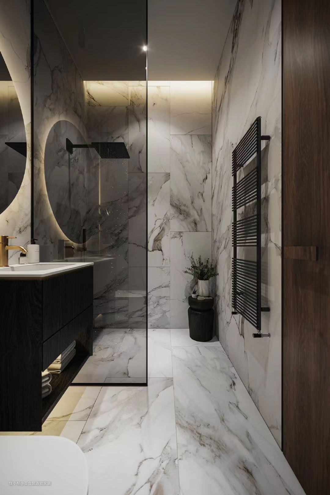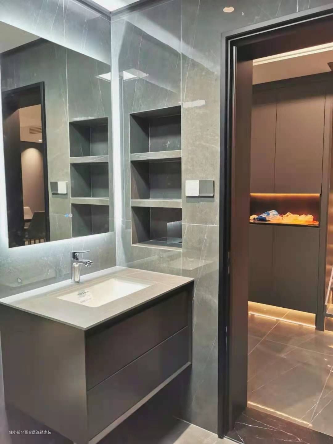 主卫的墨纹瓷砖通铺,不仅美观大方,更易于清洁,单扇玻璃的干湿分离设计,让洗浴空间更加整洁。客卫的科技感镜面与悬浮浴室柜,不仅提升了空间的现代感,更解决了镜面起雾的烦恼,墙角的壁龛设计,巧妙地解决了日常用品的收纳问题。