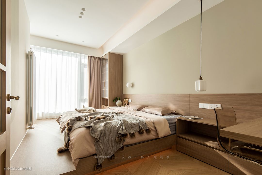 主卧的进入相对多元化,一个入口临近衣帽间,另一个则是靠近客厅外窗的折叠门,这样一来,无论在卧室的任何位置都能以更近的路线穿梭于不同空间。 为了营造静谧的入睡环境,卧室的墙色以及用到的材质相比外部更深一些,顶部也配合遮梁做了悬浮吊顶,整体层次递进且丰富,也不失秩序感。 女屋主非常喜欢落地窗的设置,但房子所在的楼层外墙是大楼装饰层,所以窗与地面之间有一定落差,为了满足女屋主,设计师在卧室大胆尝试了地台床形式。不仅增加了入睡艺术感,补齐的高度差也刚好实现了落地窗的梦想。