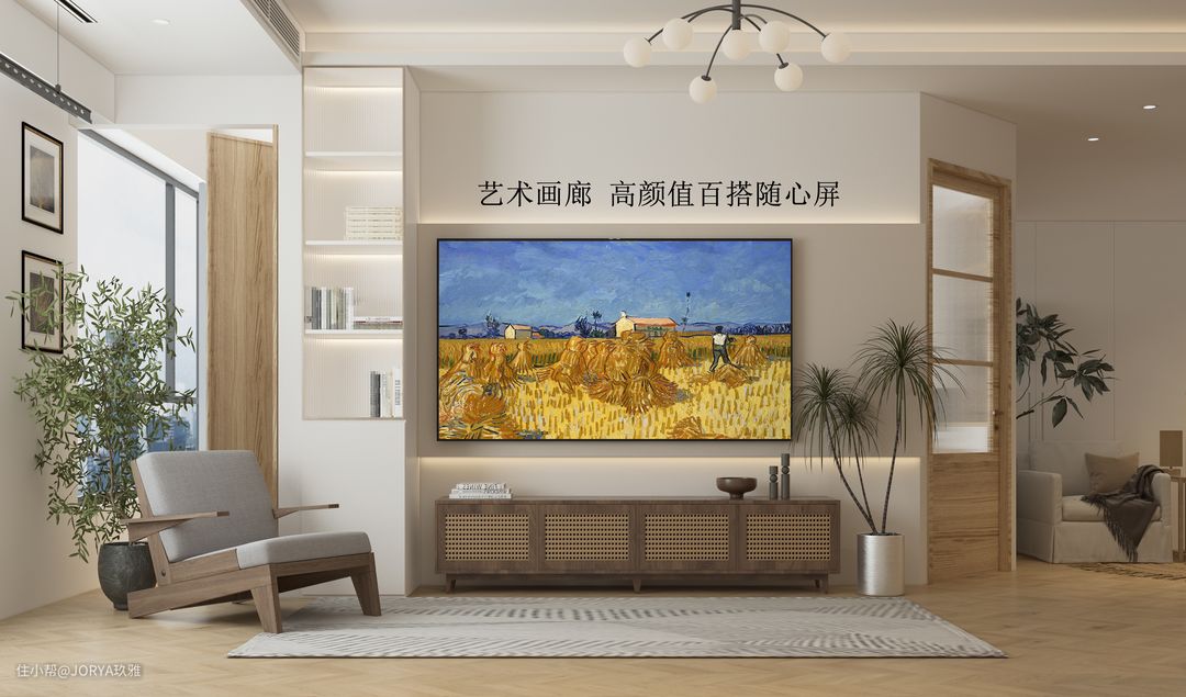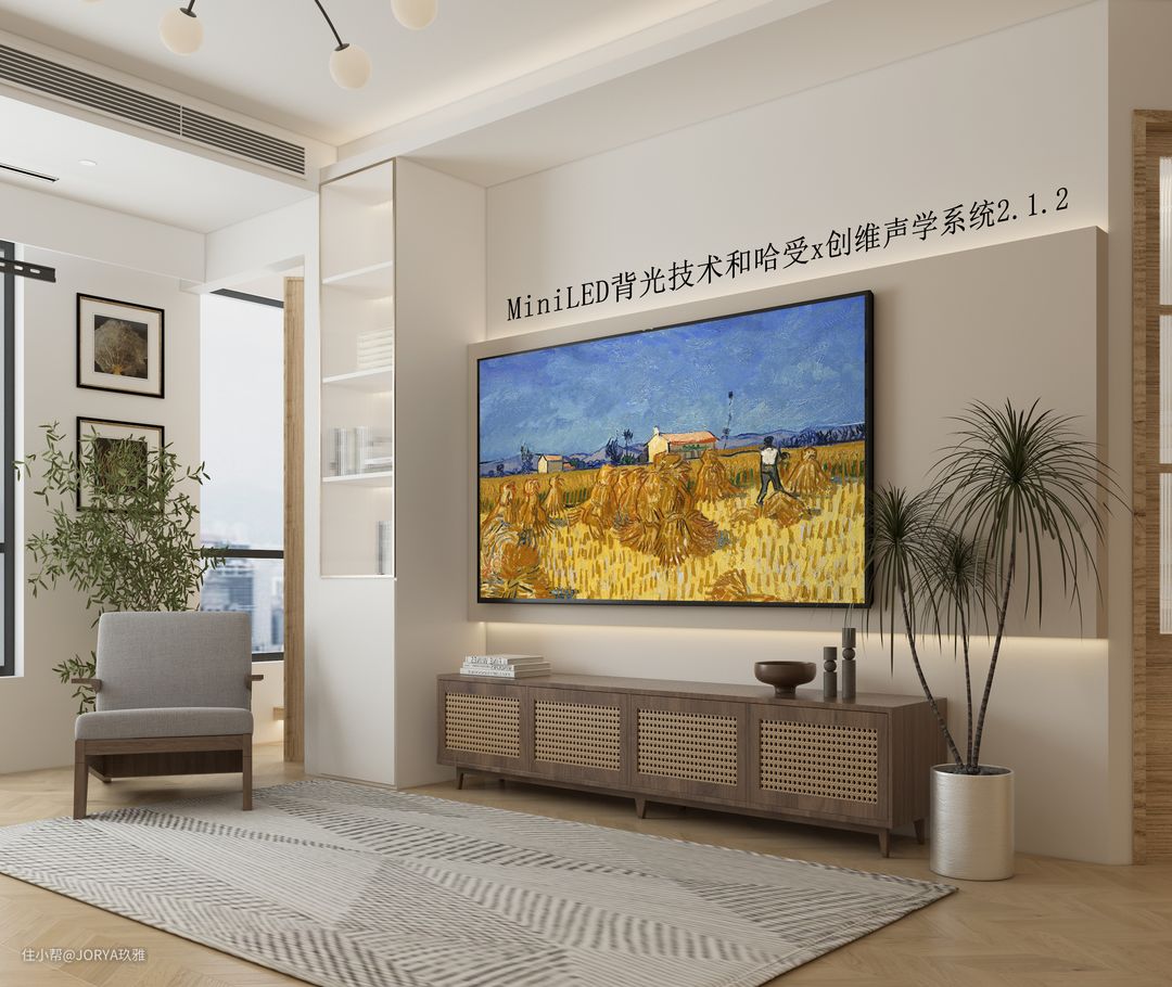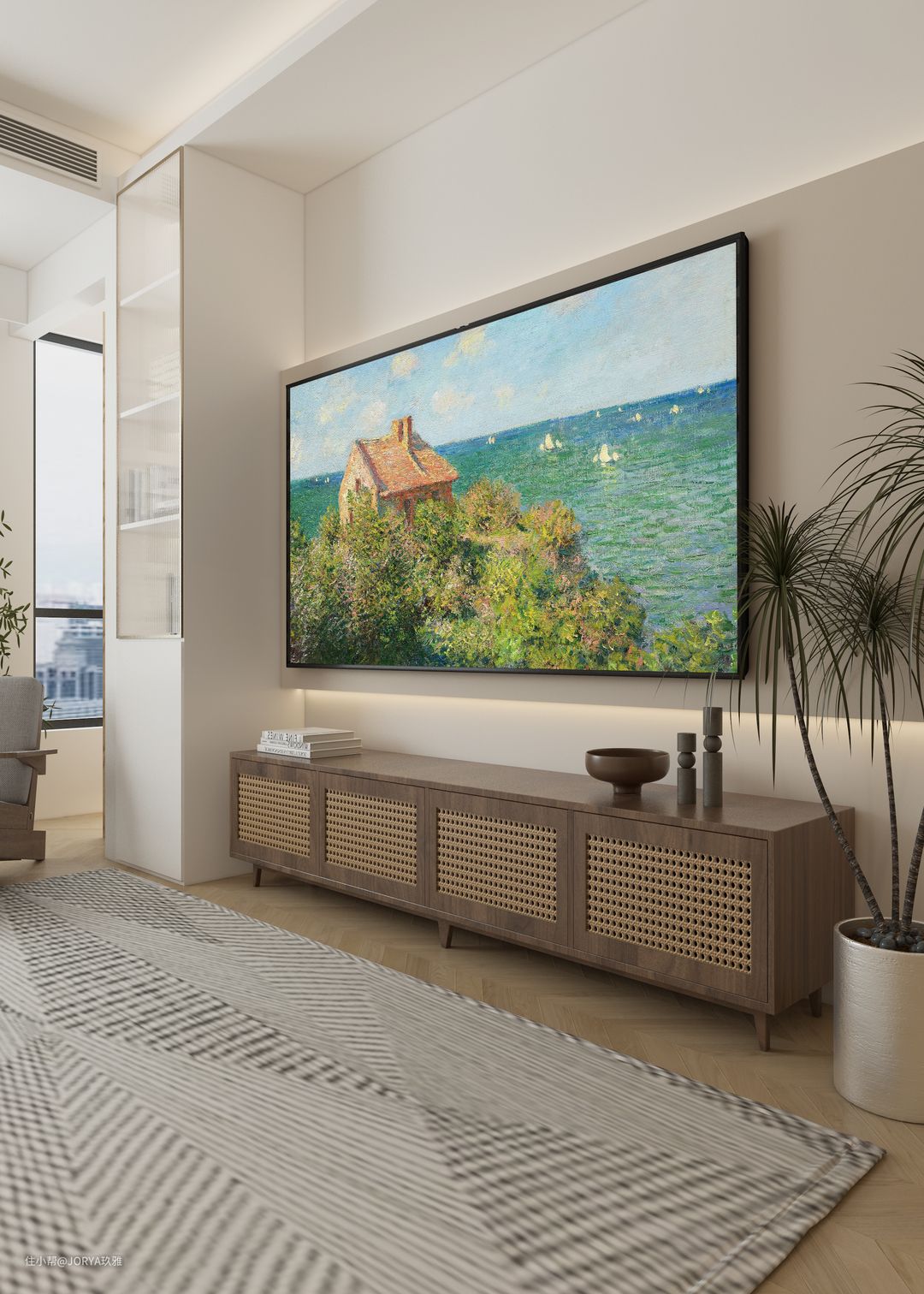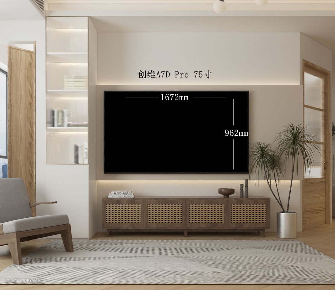 客厅作为两条动线的交汇处,十分重要。整个空间风格上比较现代,大多线条感比较强,“直来直去”,干脆利落。为了中和这种硬朗,让家变得温馨,我们点缀了弧形吊顶,圆形立柱,圆滚滚的球灯饱满可爱......配色上也采用了浅米、奶咖、浅棕等暖色调来做搭配,这些点缀让客厅变得更加柔和起来。 在电视上,我们选择了创维A7D Pro壁纸电视,其百搭的外观设计、超薄的机身和绝佳的音画性能,得到了屋主夫妇的一致认可。夫妇俩平时都有居家办公的需求,所以工作区是必备选择。我们在沙发背面设置了定制长桌工作区,两人可以共同在这儿看电视、聊天,也可以各自忙碌互不打扰,既能互动又能独立。 从办公桌内侧到电视距离有3.2米,沙发到电视距离还要更近一些。关于电视背景墙的设计,我们在整面电视背景墙上做了凸起的造型,2.8米*1米的悬浮立体造型让整面电视背景墙更有层次,暗藏的灯带氛围感十足,但是悬浮的造型背景墙也限制住了电视的大小。 创维壁纸电视A7D Pro有65/75/85三种尺寸,都说大电视看起来更爽,可是考虑到合适的观影距离以及电视背景墙造型尺寸,我们最终选择了75寸,不图大,适合自己才是最重要的。 以往老款的彩电都带着“小背包”,比较重,容易藏匿积灰,侧面看还影响美观,所以在电视选择上女屋主更考虑轻薄且能贴合墙面的电视,A7DPro沿袭创维壁纸电视独有的无缝贴墙设计,实现机身与电视背景墙面的“零距离”贴合,同时还避免了藏匿积灰,不便清理的难题。 电视背景墙的装饰整体追求简约,创维壁纸电视的加入,丰富了整个墙面的造型,整体呈现简约不简单,干净的墙面在39.9mm超薄壁纸电视的搭配下,极具装饰性,空间充满格调美。只需要根据自己的喜好,启动“百变艺术屏,200多幅世界名画可以跟随整屋风格、业主喜好随心切换,客厅秒变艺术馆。更有还有生活此刻、氛围空间、家庭照片墙等三种模式,过节时我们可以节日氛围的场景进行切换,实用价值与美学价值兼顾,更能提供不同的情绪价值。全系列产品开机无广告,这一点在当今广告泛滥的电视产品中尤为难得,可以大大提升了业主的使用满意度。 客厅旁边是落地窗,强烈的采光会降低电视显色度,开窗也会影响音质......市面上许多壁纸电视画质都不错,但是音质方面无法得到更好的满足,所以一款能同时拥有高端画质和高配音质的电视变得尤为难得。 作为设计师,我们对色彩的敏感度极高,这使我们能够深刻理解显示设备在色彩表现上的重要性。在体验创维壁纸电视A7D Pro时,我们注意到它在播放色阶图时的表现,色块之间的过渡非常清晰,这表明电视在色彩还原上具有很高的准确度。电视采用的Mini LED背光技术,在亮度和对比度上提供了显著的优势,同时保证了色彩的高饱和度,使得画面色泽鲜艳且变化丰富,为观看者提供了极佳的视觉体验。 在音响系统方面,创维A7D Pro壁纸电视配备了创维声学系统2.1.2,一个重低音单元和两个天空声道,这样的配置在观影时能够营造出声音由远及近、由大到小的立体效果,让观众仿佛置身于影片之中,享受到不输于影院的沉浸式体验。 创维A7D Pro壁纸电视在现代家居产品与居住环境融合的趋势中,确实表现出色,它的设计和性能不仅完美适配了业主的家居风格,也成为了现代家庭生活的理想选择。创维品牌在消费者心中享有极高的声誉,A7D Pro壁纸电视自线上推出以来,仅一年多的时间,就已经成为艺术电视类别中广受消费者青睐的产品。其领先的外观设计、先进技术,以及卓越的音画配置所带来的极致观影体验,无疑使其成为艺术电视销量中的佼佼者。