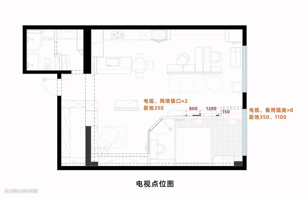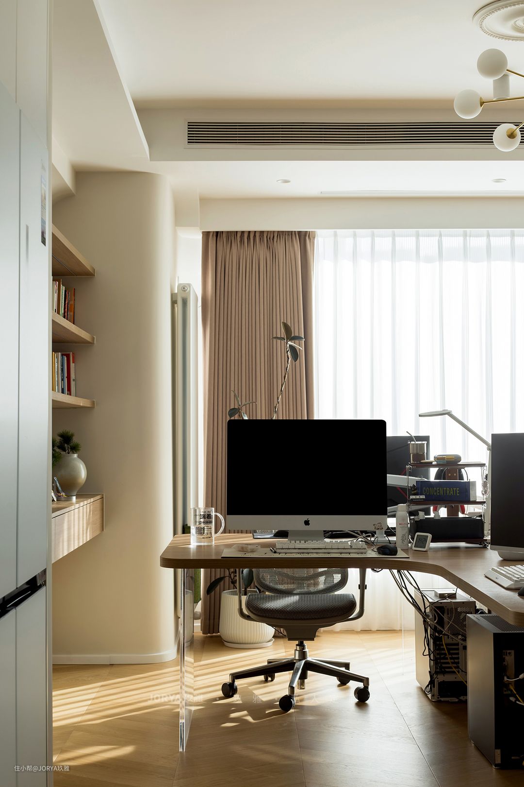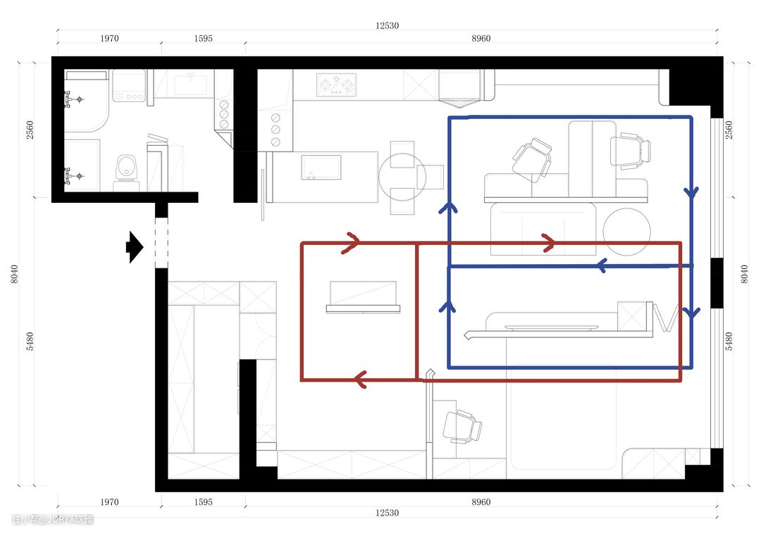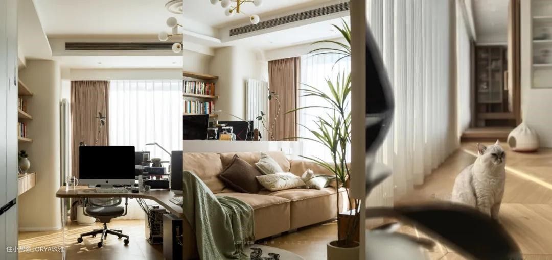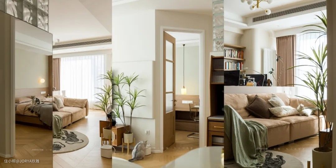 改造后的房屋出现两条“∞”动线 动线一:工作区-客厅-卧室 在设计中,我们采取了创新的空间重塑策略,以满足家庭的多样化生活需求,并增强空间的互动性和舒适性。我们将西侧的卧室空间进行了改造,将其转变为一个宽敞的客厅区域。这一改变让客厅成为了家中的社交和休闲中心,提供了充足的空间供家庭成员聚集和互动;将厨房与客厅设计为开放式空间,形成了一个近9米长的连续区域。这样的设计不仅让空间显得更加开阔明亮,也促进了家庭成员之间的交流与互动;为了满足业主二人的工作和陪伴需求,我们在客厅中特别规划了一个双人办公区,这样的布局旨在满足了业主的功能和情感需求;通过将靠窗一侧与卧室之间的隔断打通,提供了从客厅直接进入主卧的便捷通道,不仅增强了空间的延伸感,也提高了整个家庭动线的灵活性度。 动线二:多功能区-卧室-客厅 我们将原有的储物间入口改至南面,增加隐藏衣帽间和靠墙收纳柜,衣帽间不仅提供了额外的存储空间,而且方便家庭成员从玄关进入后,能够方便地更换衣物,使得动线更加流畅和自然。收纳柜的设计既增加了储物空间,又保持了空间的整洁和有序。从玄关换鞋区脱下外套后,可以直接来到这个衣帽间更换其他衣物,整个动线设计十分人性化,确保了从户外到室内的过渡既方便又舒适。为了保持空间的开放感同时提供适当的遮挡,我们采用了高颜值的玻璃砖结合半墙的设计,这样不仅美观大方,还保证了空间的通透性,同时为开放式空间提供了必要的隐私保护。 整个空间设计融合了现代设计理念和一些复古元素,在家具和装饰的选择上,我们遵循有造型但不繁复,配色饱满但不厚重的原则,实用并且还美观。例如沙发的选择,有质感还扎实,坐着舒服还能防猫爪。我们在电视背景墙上做了隐藏灯带,简约的线条装饰美观还“不抢戏”,干净的墙面更加适配女业主中意的壁纸电视。