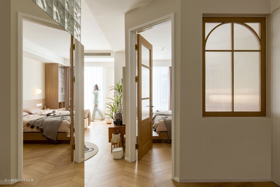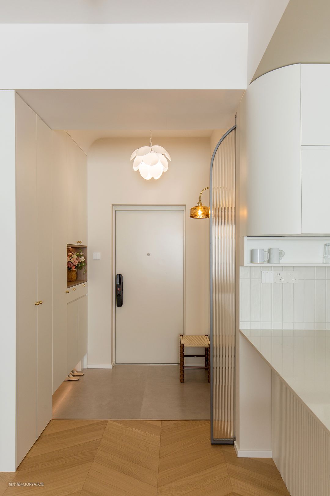 入户收纳是刚需,但原玄关的宽度只有1.5米,两侧分别是卫生间和储物间入口,于是设计师将储物间入口挪至另一侧,玄关设置完整高柜,4段45cm进深鞋柜满足日常使用,外套包包则放入旁边60cm进深的次净衣柜,方便高效,也减少了灰尘带入空间的可能性。 玄关对面墙体中,隐藏了一扇90cm宽的长虹玻璃推拉门,需要时可以随意展开到任意宽度,灵活解决入户直面客厅的隐私问题。