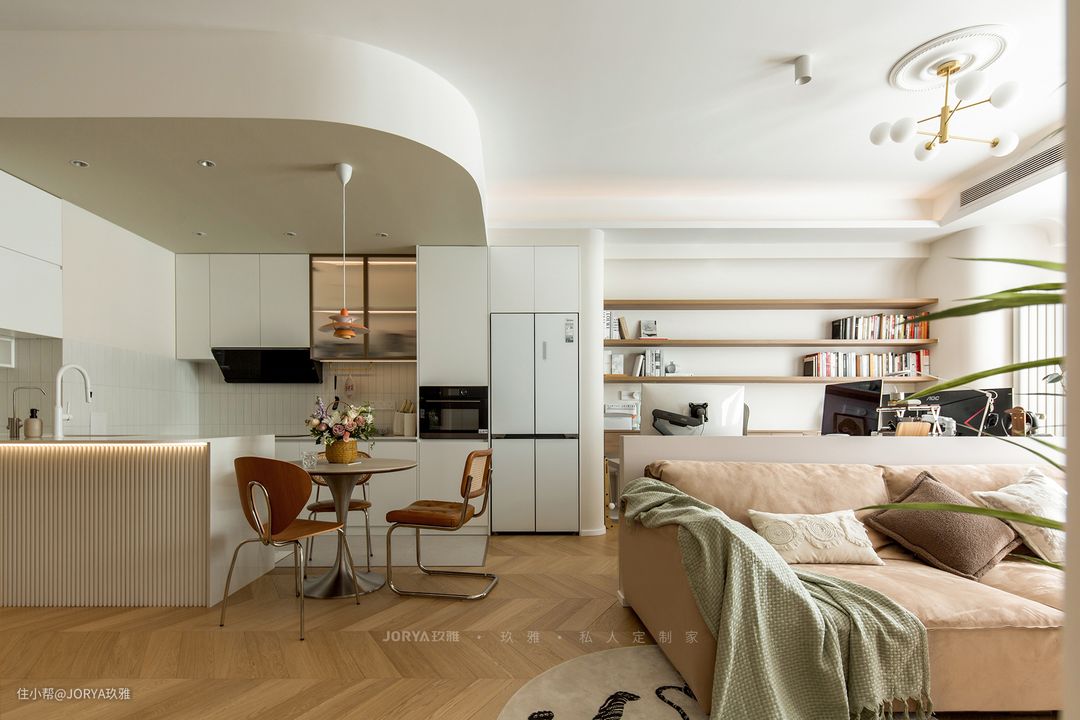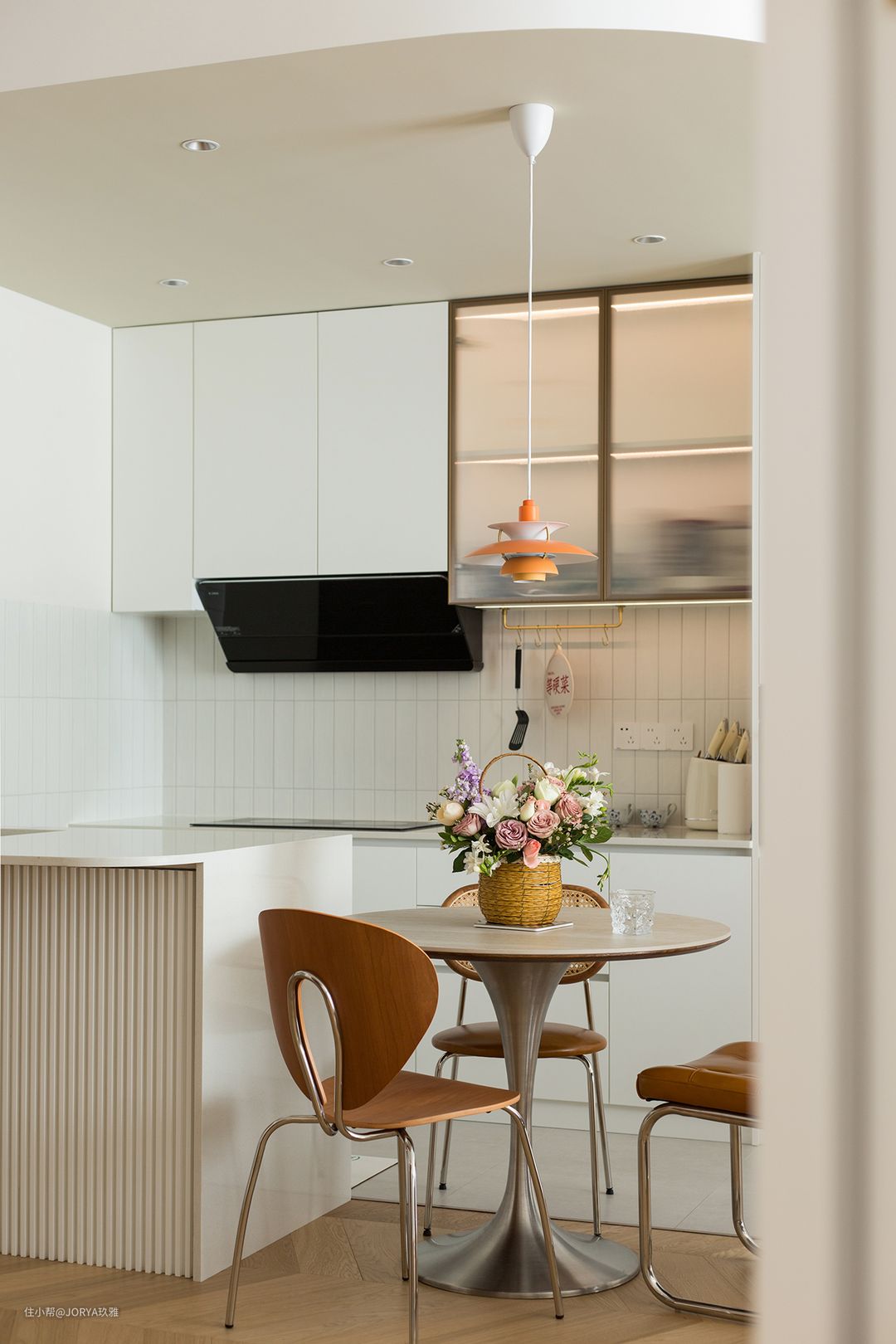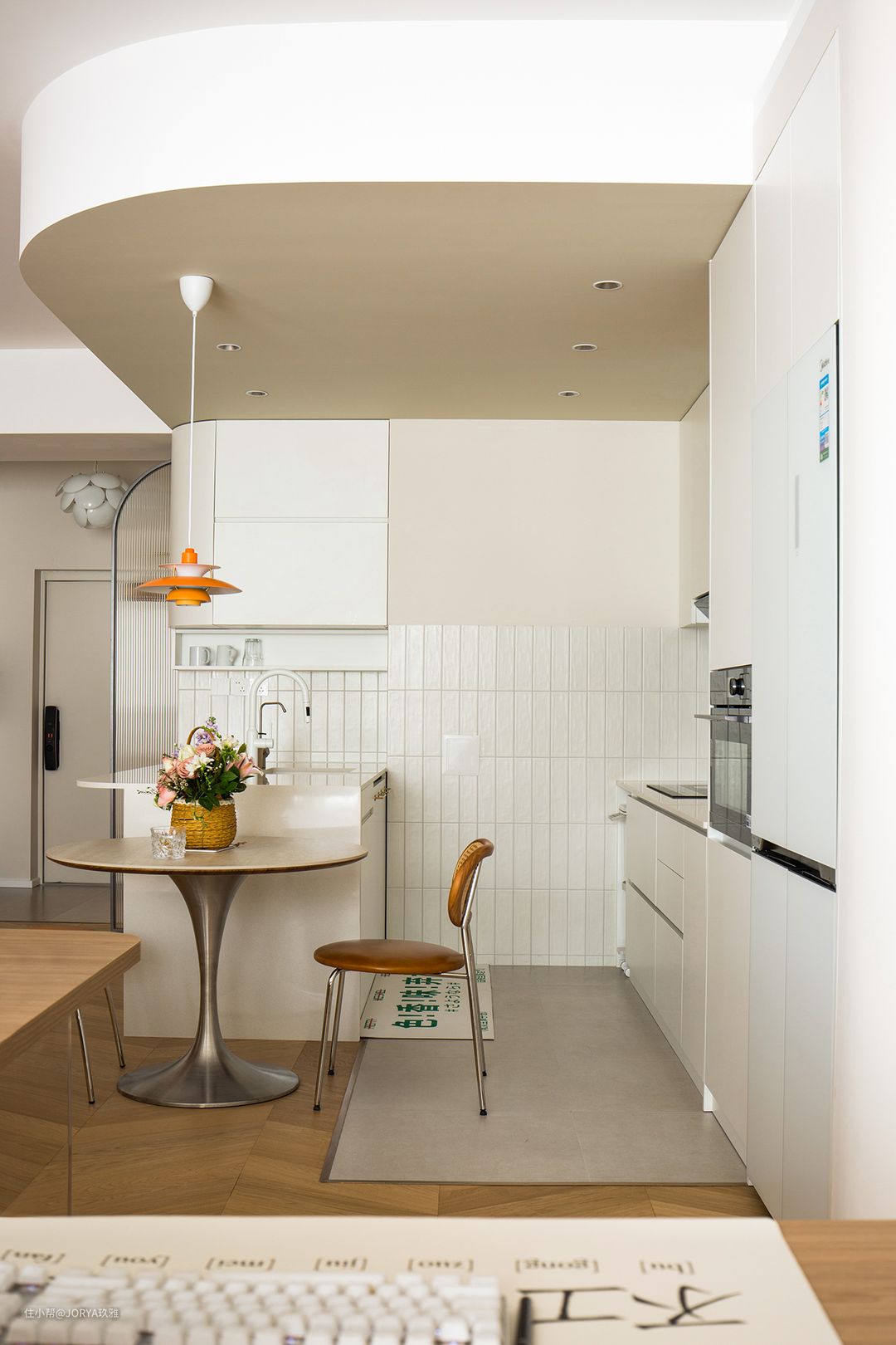 整个餐厨区拆除不必要的墙体后,整体厨房台面也得以延伸,60cm进深的橱柜满足了日常收纳的需要,超薄冰箱也能很好嵌入柜体,整体视觉和谐统一。光泽感满满的手工小白砖拼接半墙,美观且便于打理。 岛台水槽结合,备菜切洗动线设置合理便捷,朋友小聚时还能一起动手,互动性很强。改造完后,这里也成了业主心头爱的场所之一。 日常家里只有两人用餐,小圆桌足够使用,飞碟灯高度合适悬于桌上,柔和的灯光映衬出温馨的用餐时光。位置也紧邻岛台,一转身的距离就能搞定整个下厨用餐流程,可以说是懒人动线了。