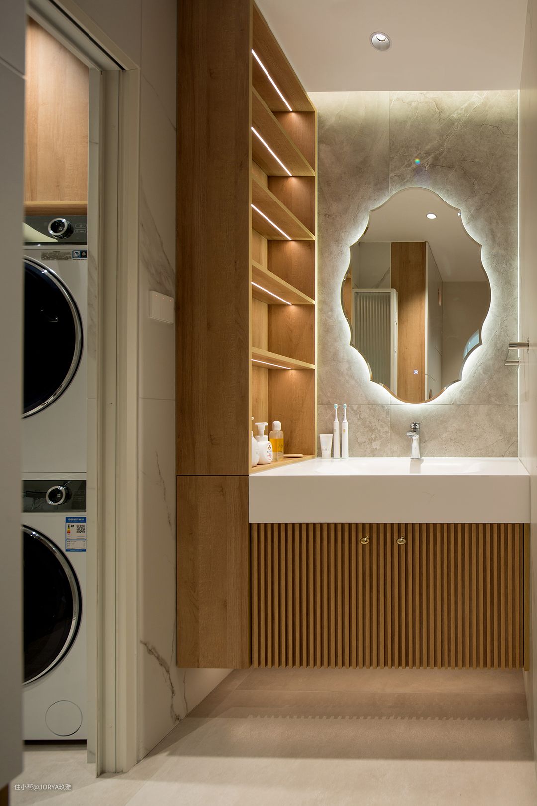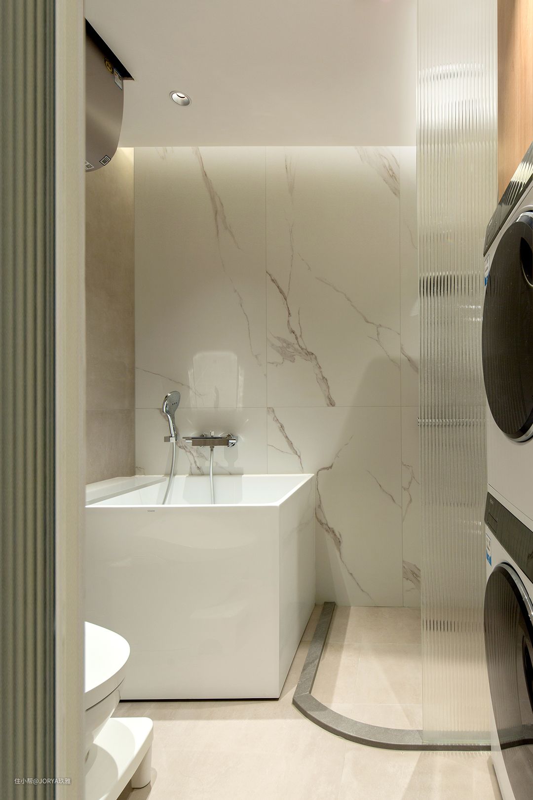 玄关对面则是卫生间区域,在这里进行了空间功能的划分,集合了宠物玩耍、用品收纳、卫生间干湿区、洗烘区等多重功能,集合一体高效管理。 相较于全屋,卫生间暗砖红色的墙漆与大理石墙砖、木栅格等材质,组合出丰富且与众不同的视觉层次。大胆的配色让居住者步入时有种天然的空间转换感。 卫生间做干湿分离,男屋主用传感器做了灯光联动,进入干区,灯带感应亮起,仪式感十足。女屋主说每次来卫生间都会被美到,心情超好~ 左转进入湿区,马桶浴缸淋浴,以及洗烘区依次罗列,独立且融合。这里也同样延续了灯带设置,沐浴时打开音响,在柔和的灯光中放空大脑,放松身心,非常惬意。 家不仅仅是居所,更能成为我们提升生活品质,追求更高要求的基石。创维A7D Pro壁纸电视的存在让居住者在家就能享受到极致的观影体验,高颜值的外观恰到好处的融入家居设计中。创维电视在技术发展上不断创新,不断追求画质、音质完美,还将家居生活与艺术、科技结合。我们也一直坚持让先进的设计理念、潮流风格、智能化产品融入到我们的设计中,让每个家不失风格的同时也能保持业主的审美格调。 #家装第一线#客厅的颜值主义#品质生活好好晒#创维电视#创维壁纸电视#创维艺术壁纸电视#艺术电视#创维A7D#创维A7Dpro#墙上艺术品 #设计师怎么装电视背景墙