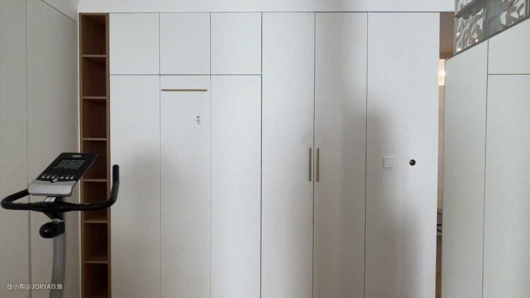 玄关的右手边,Z型定制柜沿着储物间外墙一直延续到卧室旁,形成一整个步入式衣帽间,进屋后脱掉鞋子外套,就可以到这里更换衣物,动线合理方便,一步到位。 因为这里没有直接采光,于是墙面尽量打开,只保留一部分墙体拼接玻璃砖形成空间隔断,前方设置餐边柜,后墙一整面落地镜,方便日常整理仪容。镜子在基础功能之外还能视觉放大空间,一举多得不要太方便。 储物间做隐形门,隐藏在柜门之后,4.6㎡的面积内置挂墙衣架,所有不常用的物品都可以存储于此,柜门一关一室整洁,嵌入式的墨菲床设计给亲友临时小住预留了灵活性。