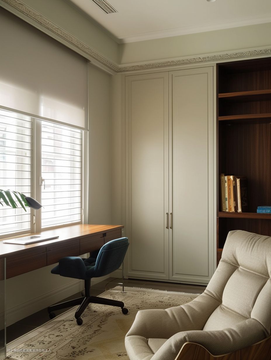 定制悬空书桌靠窗,光线充足,视野开阔。地毯让脚步更加舒适。带轮滑的椅子灵活方便。开放式书柜展示与收纳功能兼具。
