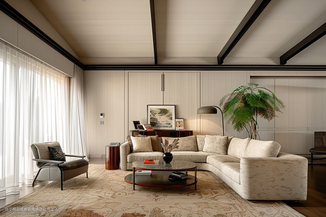 设计亮点在于无主灯设计营造出的均匀而柔和的光线氛围,让空间更显开阔与宁静。图案地毯为客厅增添了丰富的色彩和图案,成为视觉焦点之一。绿植的点缀让空间充满生机与活力。白色窗帘带来清新明亮的感觉,使客厅更加通透。L 形沙发舒适且大气,能满足多人就坐需求,搭配柔软的抱枕,增添温馨感。单人椅则提供了一个独立的休闲角落。
