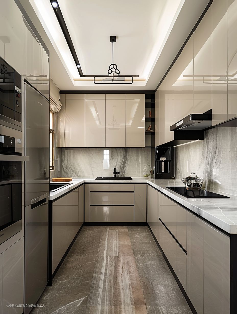 U 形橱柜布局充分利用了空间,操作更加便捷。嵌入电器让厨房更加整洁美观。吊柜增加了厨房的收纳空间。亮光橱柜表面光滑亮丽,易于清洁且具有时尚感。回型吊顶增加了空间的层次感。