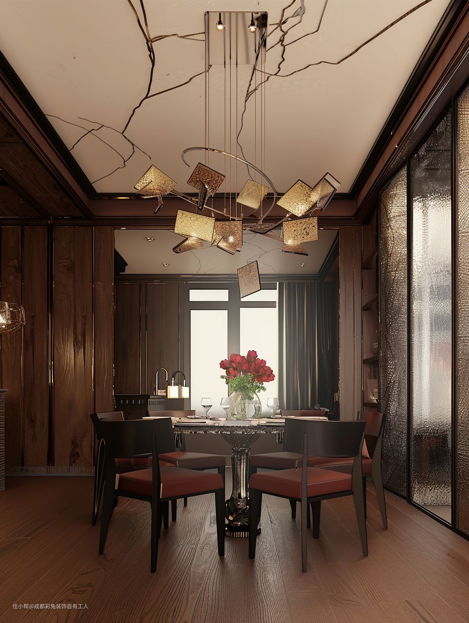 木地板带来温暖的触感,与整体风格相得益彰。圆形餐桌象征着团圆,给人以温馨的感觉。餐边柜不仅增加了收纳功能,还起到了装饰作用。吊灯造型独特,成为餐厅的视觉中心,照亮美食的同时也增添了浪漫氛围。花瓶鲜花摆放为餐厅增添了自然的美感和生机。