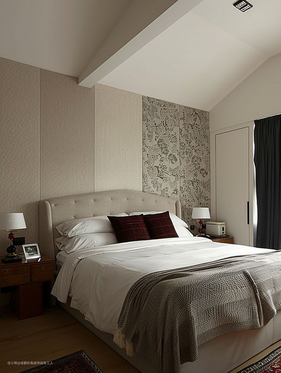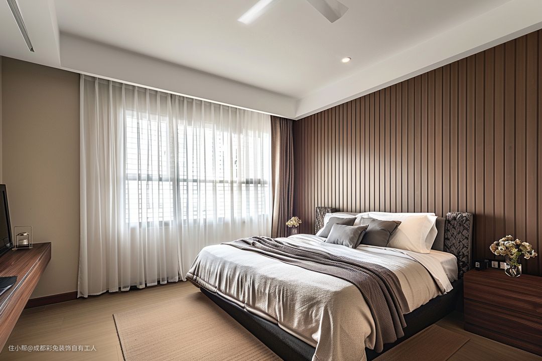 木地板奠定了温暖的基调。吊扇既实用又具有装饰性。床尾悬空书桌提供了一个方便工作学习的区域。地毯增加了舒适感与温馨氛围。木质床头柜简约自然。床品选择柔软的纯棉材质,搭配淡雅的色彩,营造出舒适的睡眠环境。