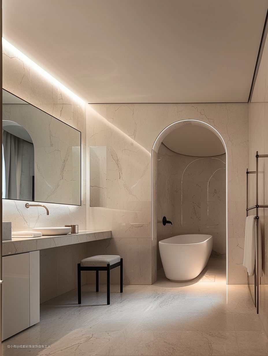 弧形壁龛下摆放浴缸,既美观又实用,增加了泡澡的舒适感。长方形浴镜让空间看起来更加开阔。坐凳方便使用。毛巾架满足日常需求。
