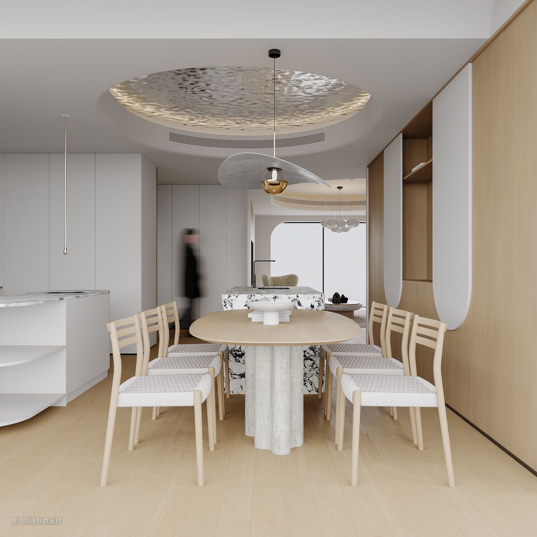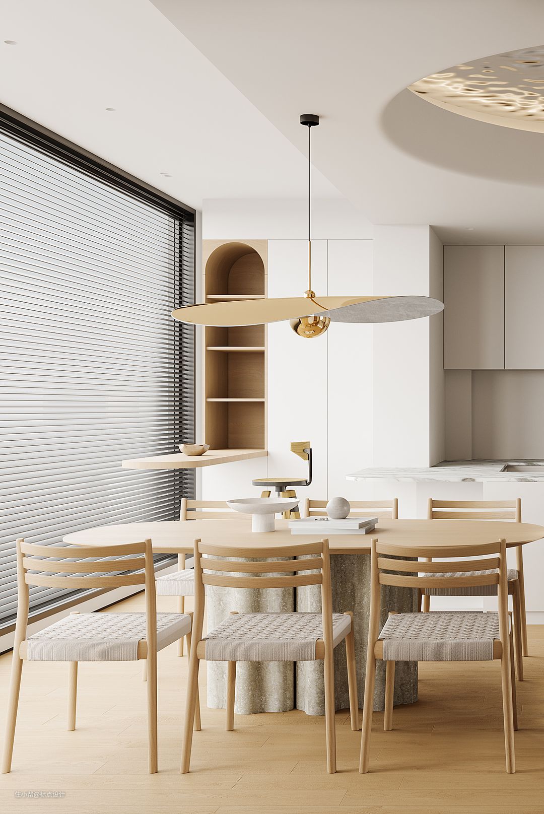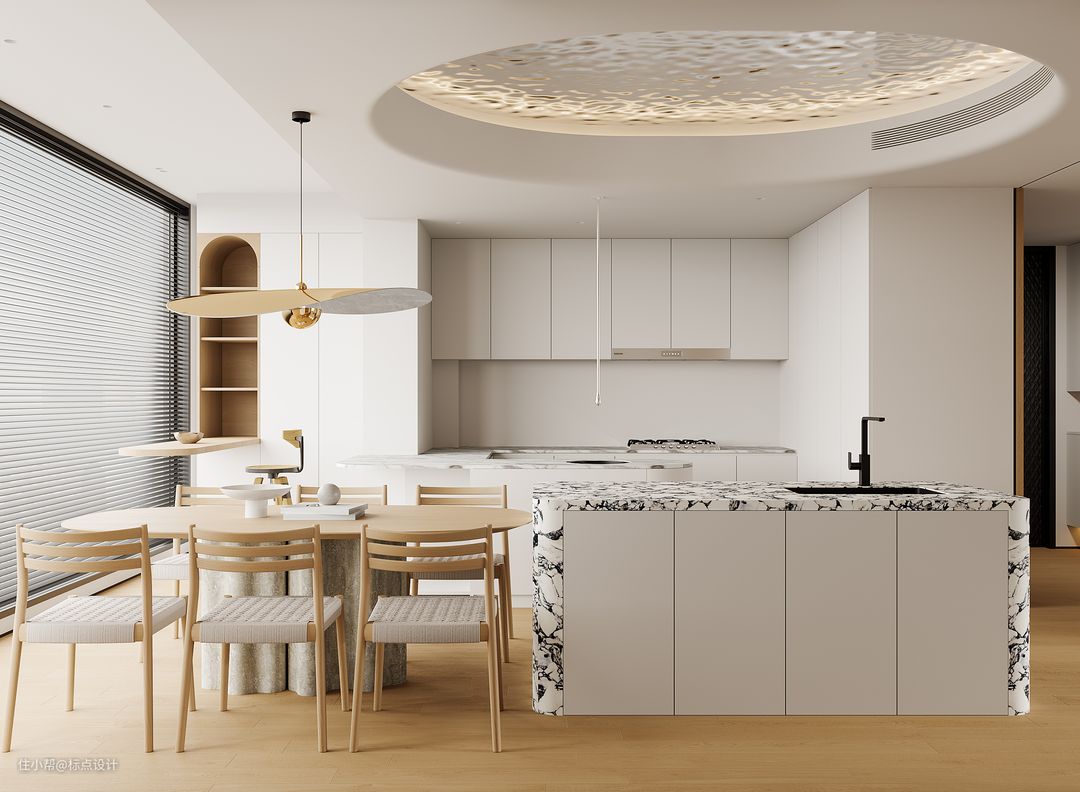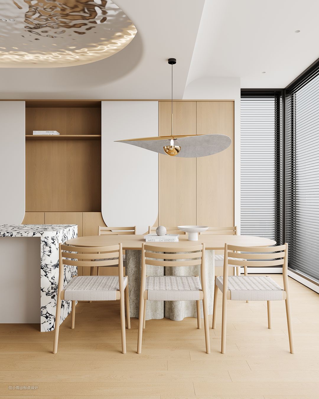 餐厅原木色与白色搭配与整体风格相呼应,保持了空间的统一感和协调性。原木色带来自然感,白色则增加了空间的明亮度和开阔感,大理石和实木材质的使用,都与整体风格相呼应,保持了空间的统一感和协调性。