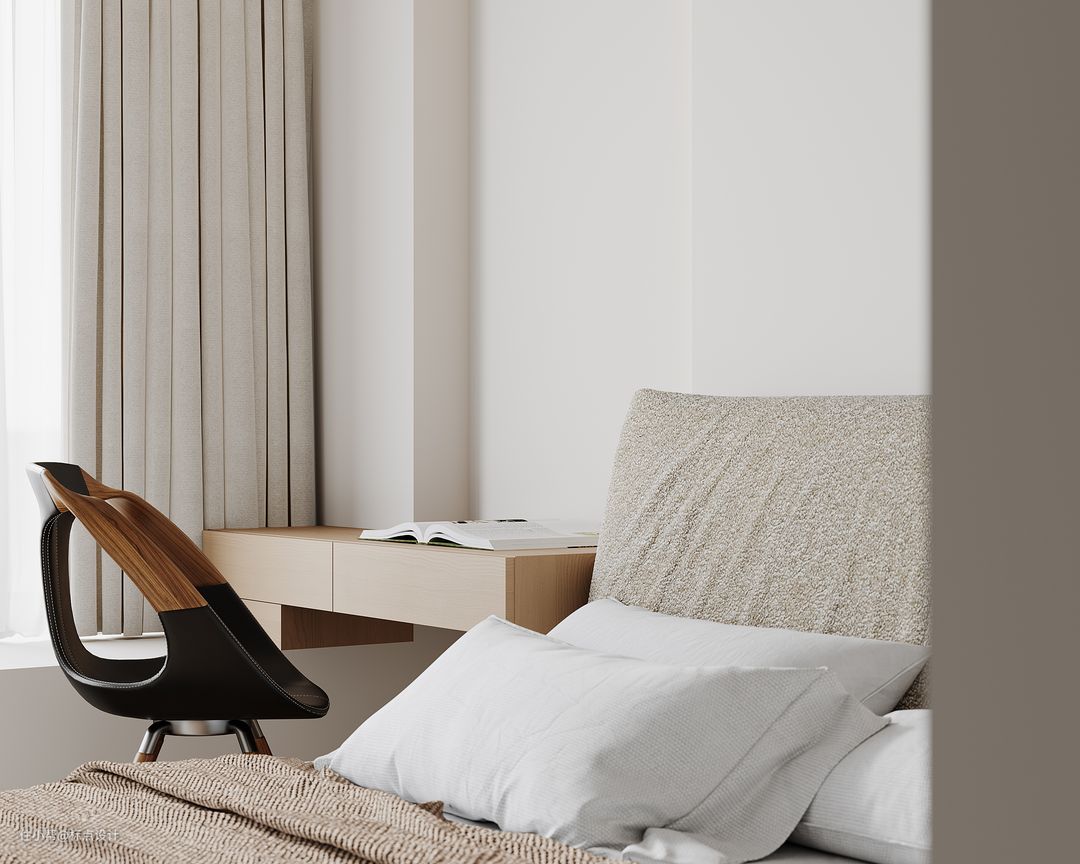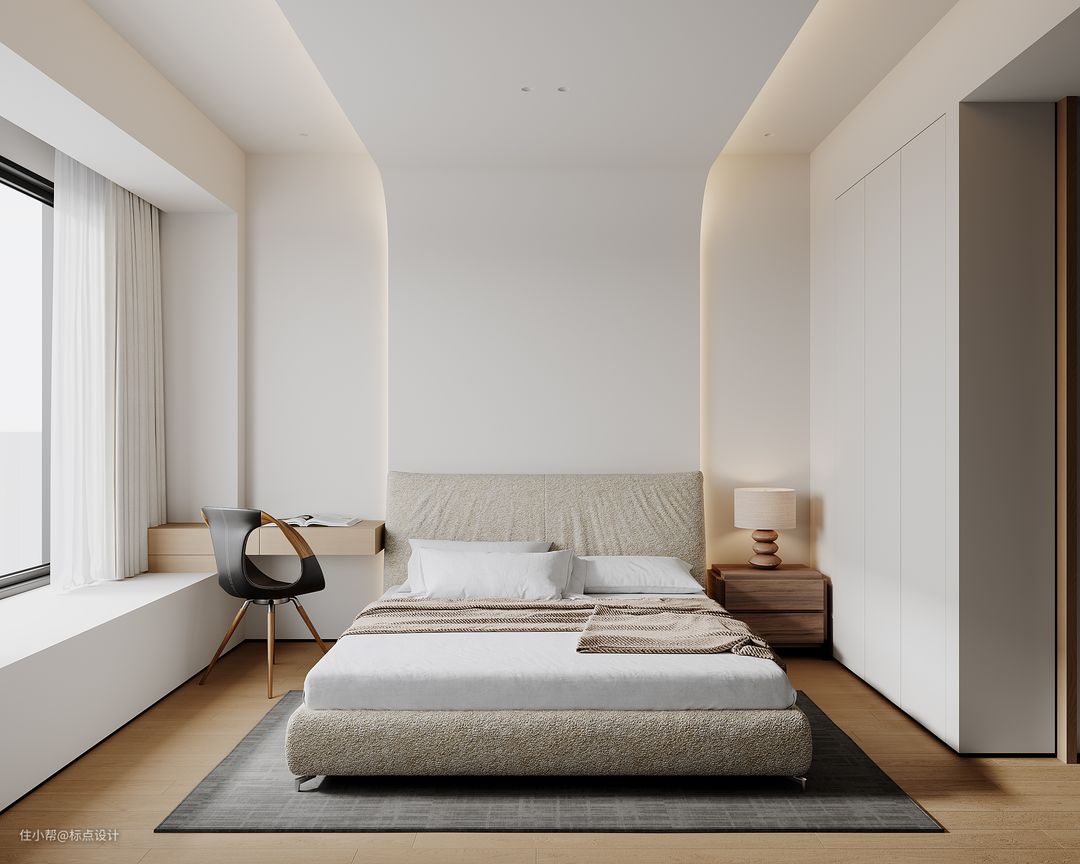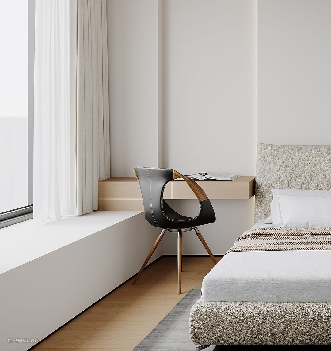 整体以白色为主色调,搭配木色家具和装饰,营造出温馨舒适的氛围。白色墙面和天花板使房间显得更加明亮宽敞。将飘窗台面延伸出来,设计成梳妆台的一部分,这样既充分利用飘窗空间,也能享受自然光线方便化妆和整理。浅木色的床头柜与梳妆台,增加房间的自然质感和温暖感。选择浅色系的窗帘、床上用品和地毯,增强房间的温馨感。柔软的布艺也可以提高舒适度。白色与木色的搭配,既有现代感又不失自然的温暖,是一个非常适合居住的环境。