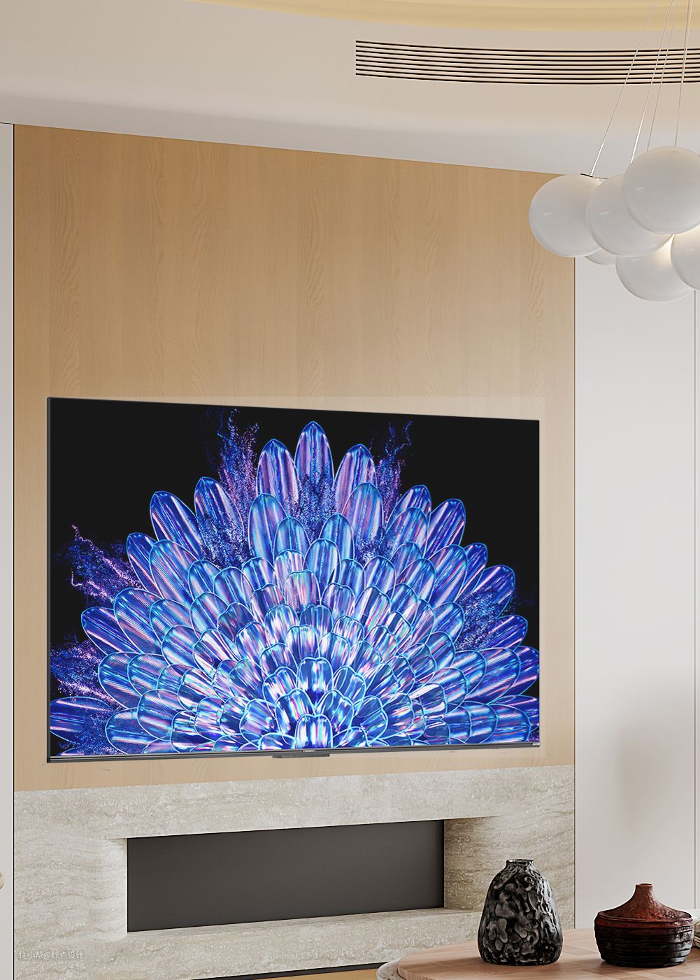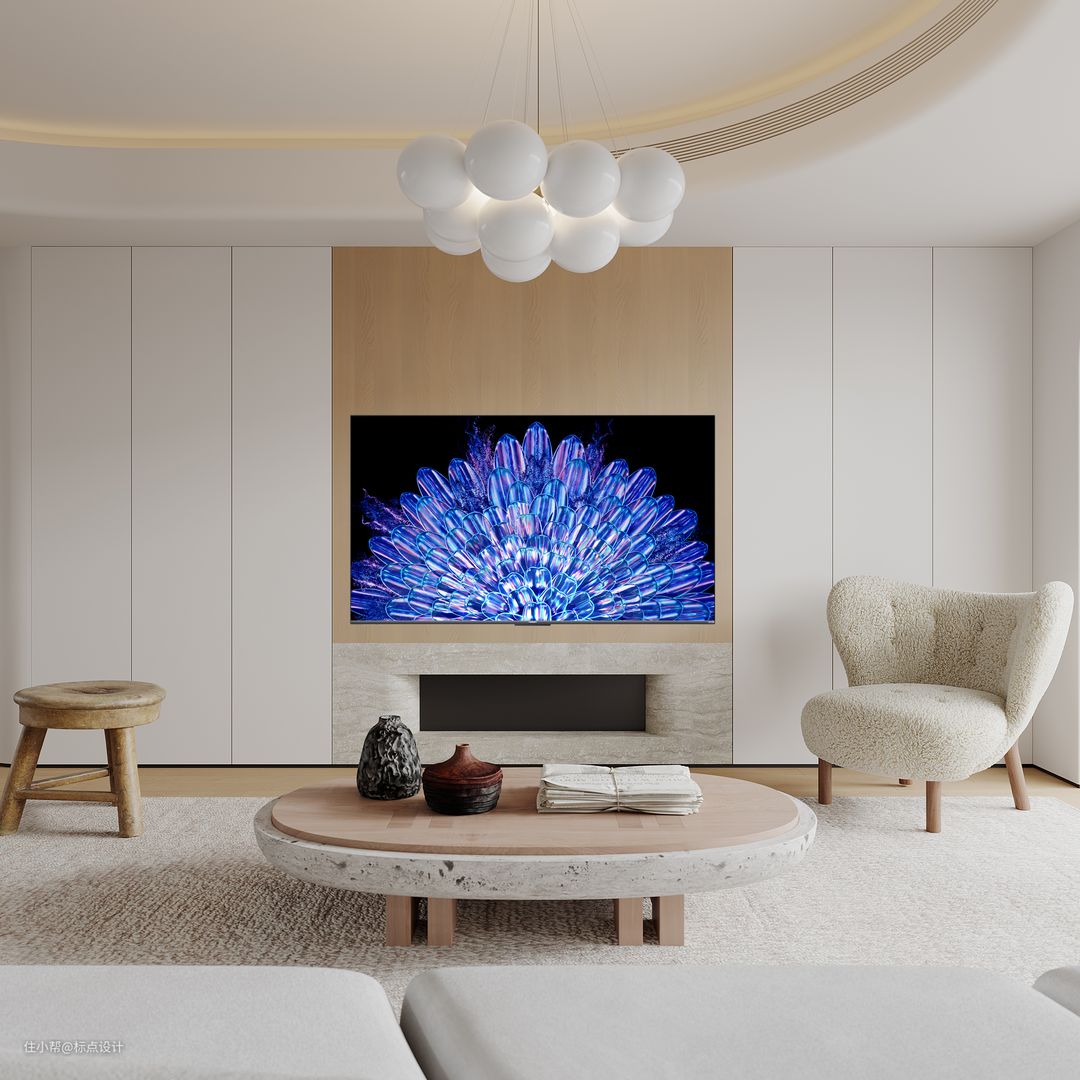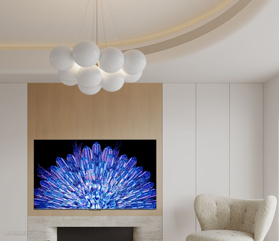 客厅以白色与木色的搭配为主营造出现代、清新的氛围。将阳台封窗纳入客厅让空间感更加开阔,同时也增加了室内的自然光线,提升舒适度。整面电视墙既能提供收纳空间,又能将电视很好地融入整体设计中,确保了视觉上的整洁和统一,靠墙设计整面的电视背景墙,让空间更完整。 在设计初期的时候业主就看上了这款创维 A5DPro 85寸电视,因为家里有老人与孩子日常他们看电视的时间多一点,所以保护他们的眼睛很重要。这款创维 A5DPro 拥有的 Mini LED功能,让白天看电视的时候不会因为环境过亮而导致画面曝光的情况,这能让老人和孩子在观看的时候,眼睛不会感到疲累,保持用眼舒适,不用担心用眼过度等问题。 在设计初期我们就有了电视的具体尺寸,根据尺寸定制合适的电视柜,因这款电视的厚度86mm,所以定制电视柜的时候,我们预留100mm的深度,保证电视安装完成后能与整体柜面保持平行,使电视机与电视柜完美融合。 这个家的客厅电视柜长度有5100mm,电视中心点到沙发的距离有4500mm,空间距离够大所以业主选择了这款创维 A5DPro 85寸电视,屏幕足够大,无需再考虑投影幕布,就能享受到家庭影院的氛围。并且考虑到现代简约风格和天花弧形造型,安装投影会破坏客厅整体美感。创维 A5DPro 电视搭载的京东方S+原彩抗光屏,无论白天还是夜晚画面细节都能栩栩如生,178度超广视角,色彩亮度都能精准呈现,很好的满足了业主对观影画质的追求。 并且电视还将回音壁内置在其中,能够为我们节省下原本需要单独购置回音壁的费用,无需再去进行外接回音壁的操作,如此一来,电视背景墙也能够保持完整且美观。它拥有12个声学单元+双分频音响,能够带来更沉浸的家庭影院“杜比厅”般的体验,使业主在家中轻松拥有身临其境般的震撼音效。