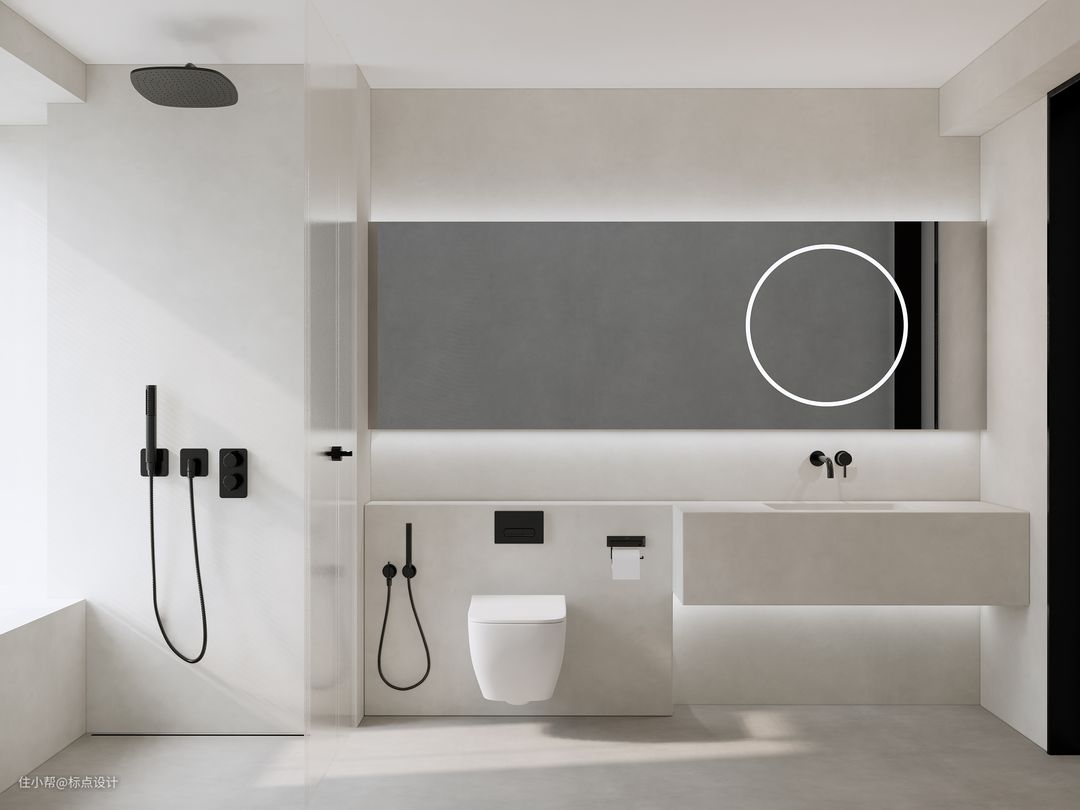 卫生间干湿分离设计,利用透明玻璃隔断,将淋浴区与洗手区、卫生区分开,防止水花四溅,保持其他区域的干燥和整洁,又能保持空间的通透感。玻璃采用无框设计,增加简约感,使整个浴室看起来更加现代和时尚,无框设计还减少了清洁的难度,保持视觉上的整洁。 墙面和地面我们用了微水泥砖,它能够实现无缝连接,从而使空间看起来更加统一和流畅。微水泥的自然质感和柔和色调,与玻璃隔断的现代感形成对比,同时又与整体空间设计风格相呼应,营造出简约而高雅的氛围。洗手区设置在靠近入口的位置,方便使用。,约的洗手台和一整面镜柜设计,提供充足的存储空间,同时保持视觉上的整洁。