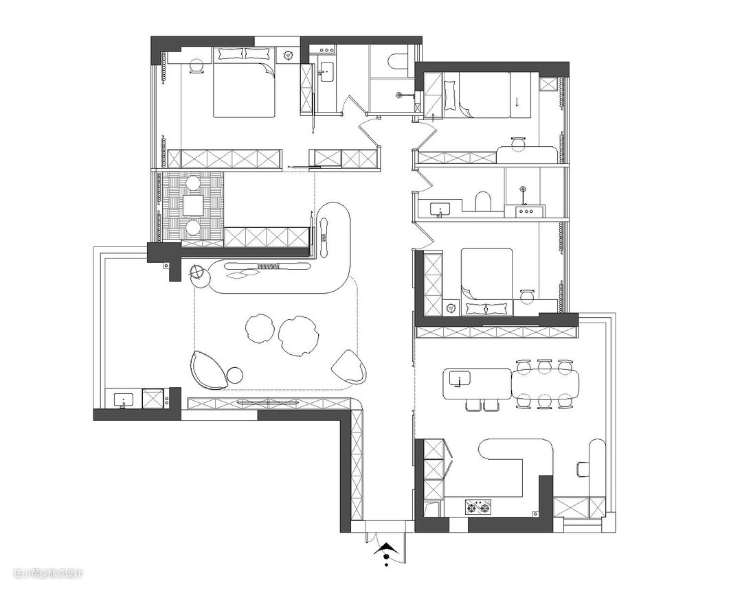 平面规划图: 1. 左右两边的大阳台对业主来说比较浪费,作为室外阳台能用到的时候比较少,我们把两边阳台都封窗,这样客厅和餐厅空间都很开阔了,餐厅也能做一个岛台空间。 2. 男业主是一位美食爱好者,平时喜欢自己做饭,希望厨房空间能大一些,把厨房与餐厅作为一个共处空间,包括封窗后的阳台,这样整个餐厨空间就很宽阔了。 3. 业主希望这个家的公共空间更大一些,孩子在家玩的地方也更开阔一些,我们把靠卧室过道的墙体内推到承重墙的位置,这样客厅与过道直接就多出一块孩子的玩耍空间。