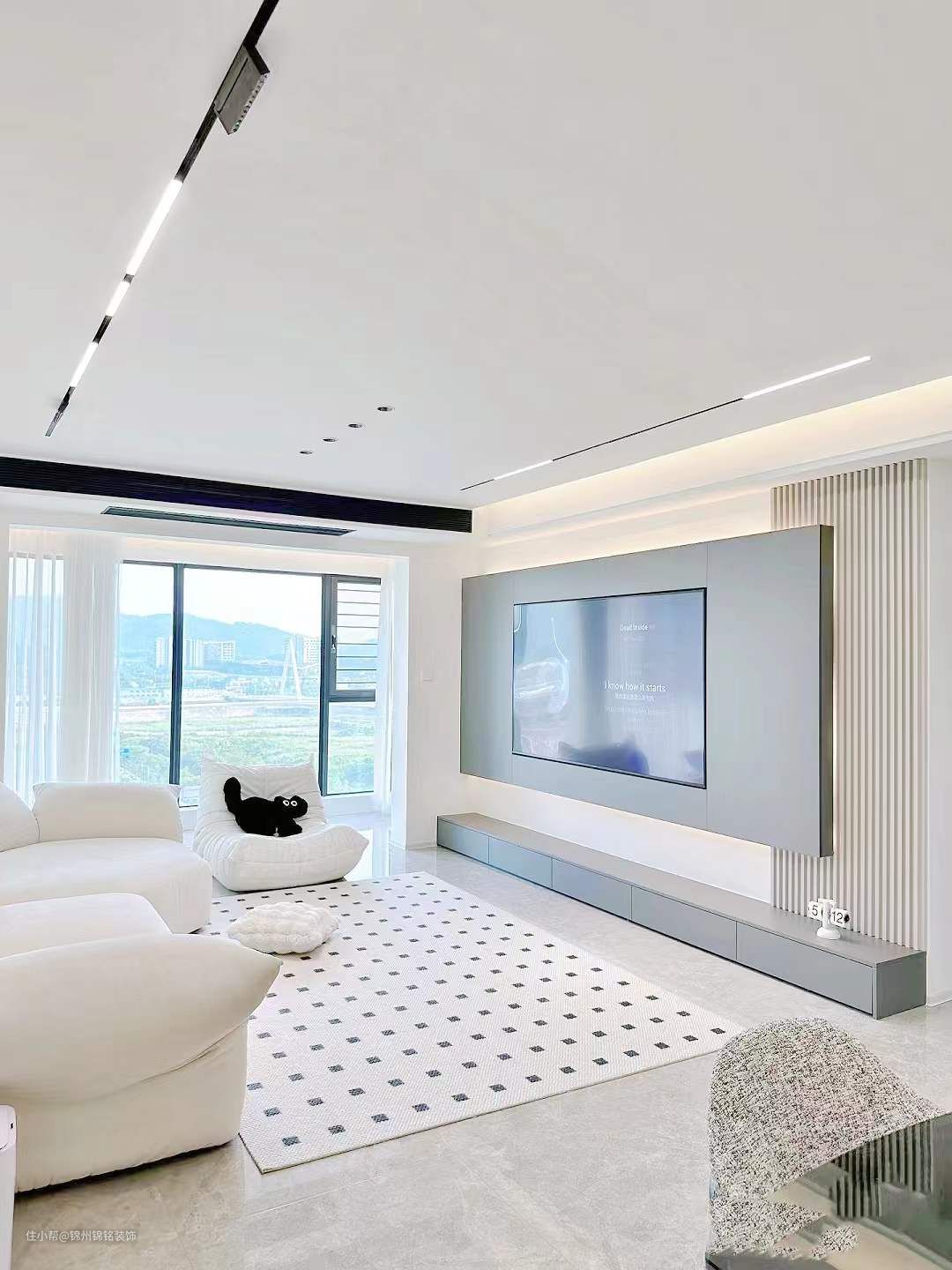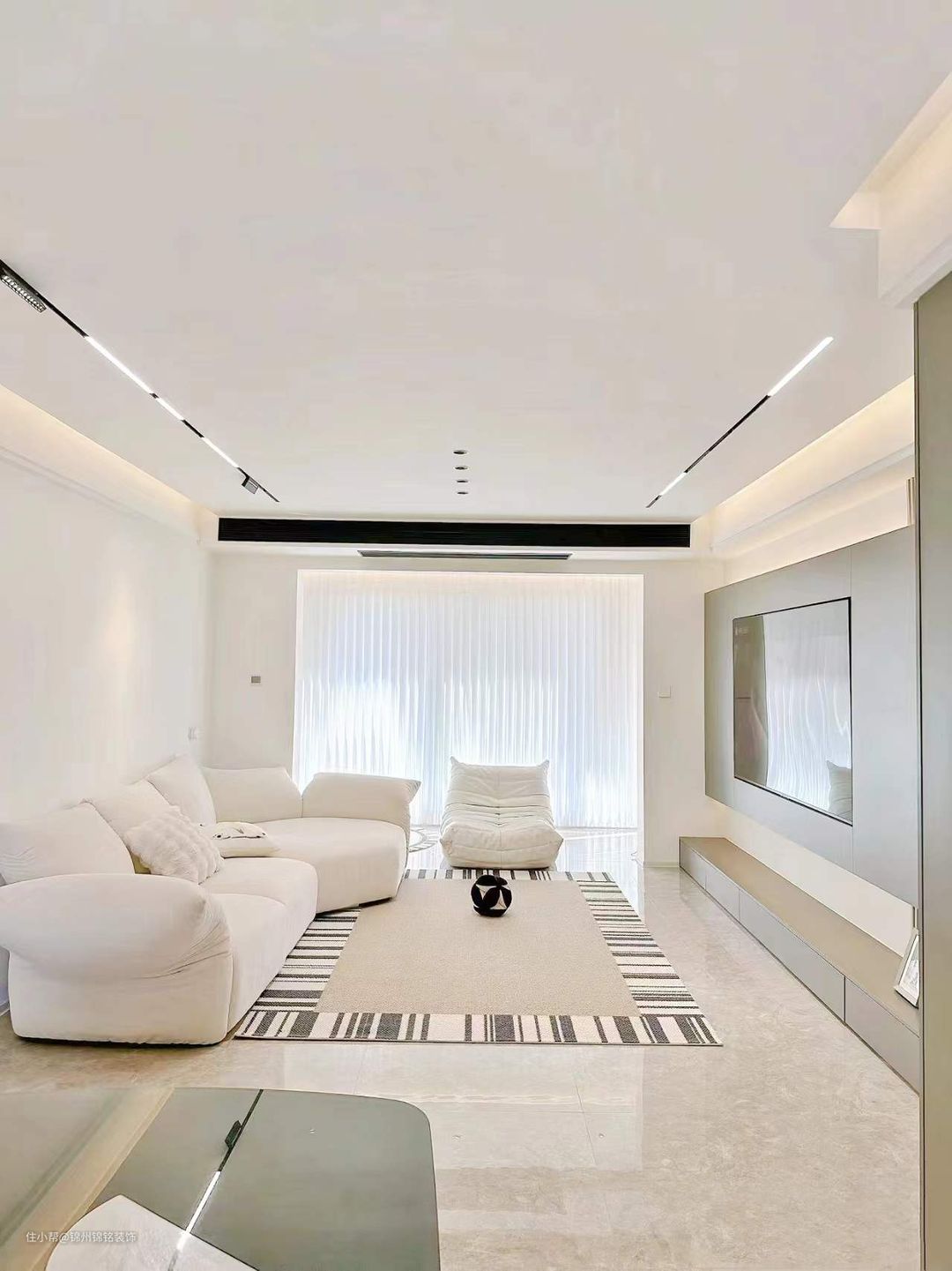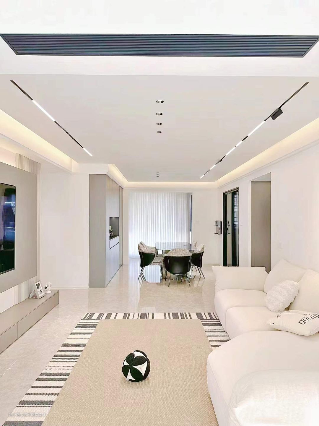 悬浮吊顶灯带的氛围灯带加持吊顶四周、窗帘盒、电视背景墙。统统安排上通铺客餐厅拆除推拉门空间更开阔。窗帘做梦幻帘可以调节光影的角度。家居色彩搭配思路是以黑白灰经典色为主软装以羊绒灰、奶咖色点缀显高级的同时多了一份温馨感。电视做嵌入式电视背景墙感觉和电视融为一体更显大气。储物空间一定要多!把东西都藏起来会发现你即将收获的是一个干净且舒适的家。