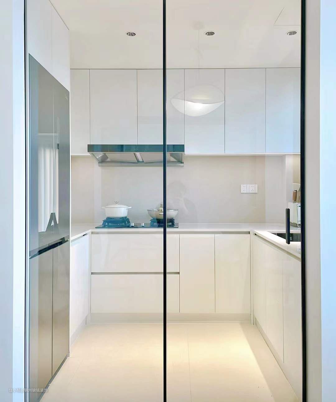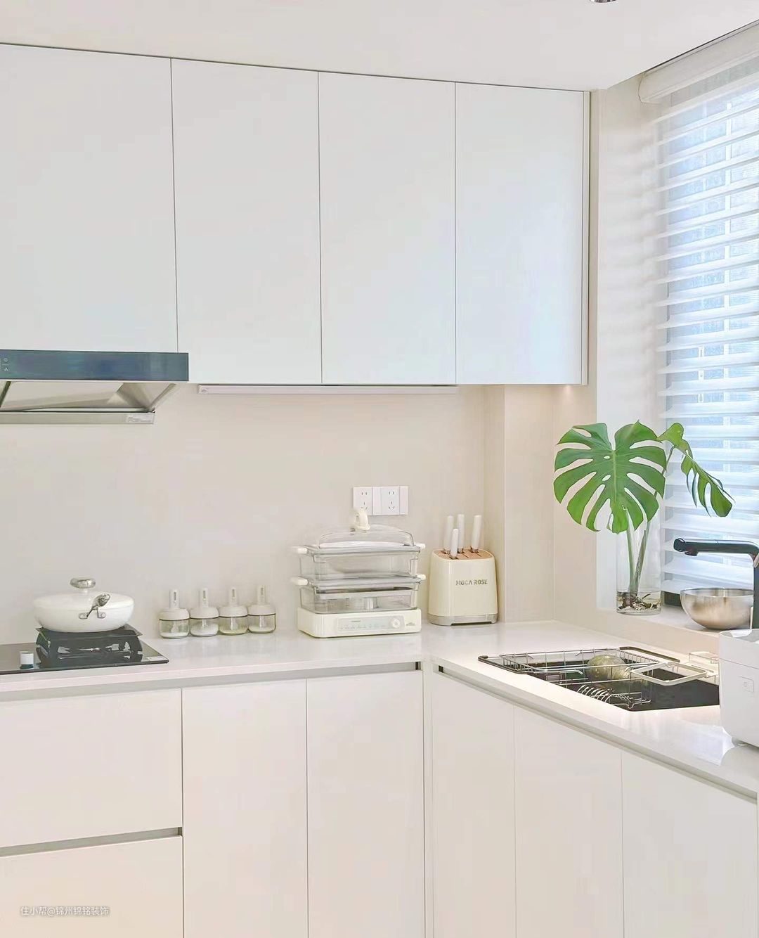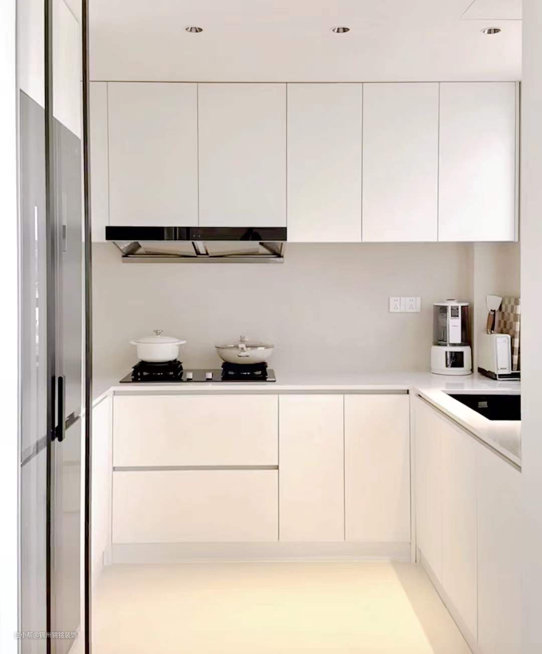用纯色大砖,灶台位置用一片90*180大砖,装上橱柜后几乎没几条缝,视觉清爽,好打理。 柜子-暖白肤感 1、吊柜柜门做一门到顶 2、地柜踢脚线用门板同材质 3、不用明装拉手,做免拉手 4、免拉手用门板拼不用型材,省钱又简洁。 台面-超白石英石,1、不要挡水条、做无下挂。 2、台面凸出橱柜柜门1~2公分,底部拉滴水线防止水顺着柜门流 水槽-大单槽 1、用大单槽 2、做台下盆台面视觉上更清爽。