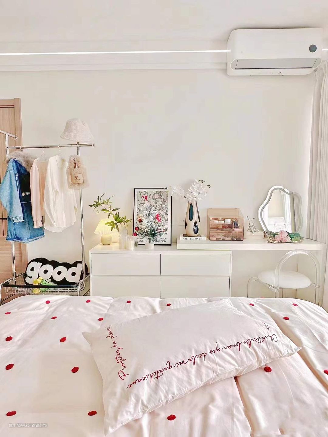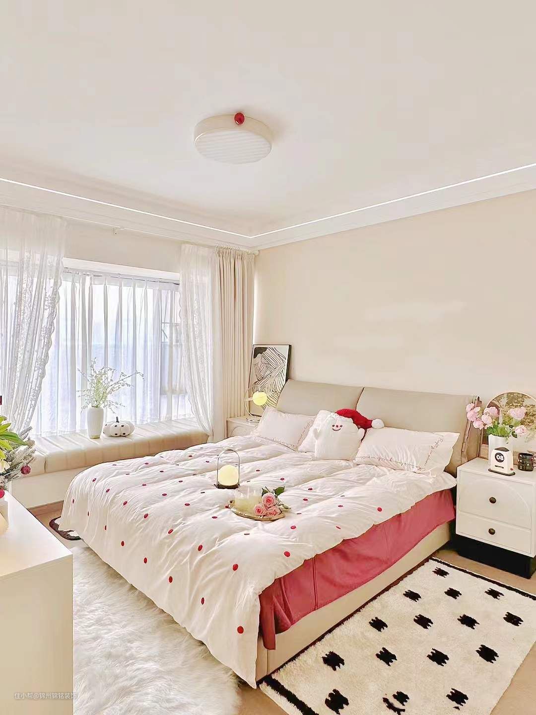 衣柜:柜门肤感白,柜体西橡木色。◆墙面:床头背景墙刷了奶咖色,其他三面墙杏子灰。◆吊顶:简单的双眼皮吊顶,走了一圈线型灯增加氛围感。