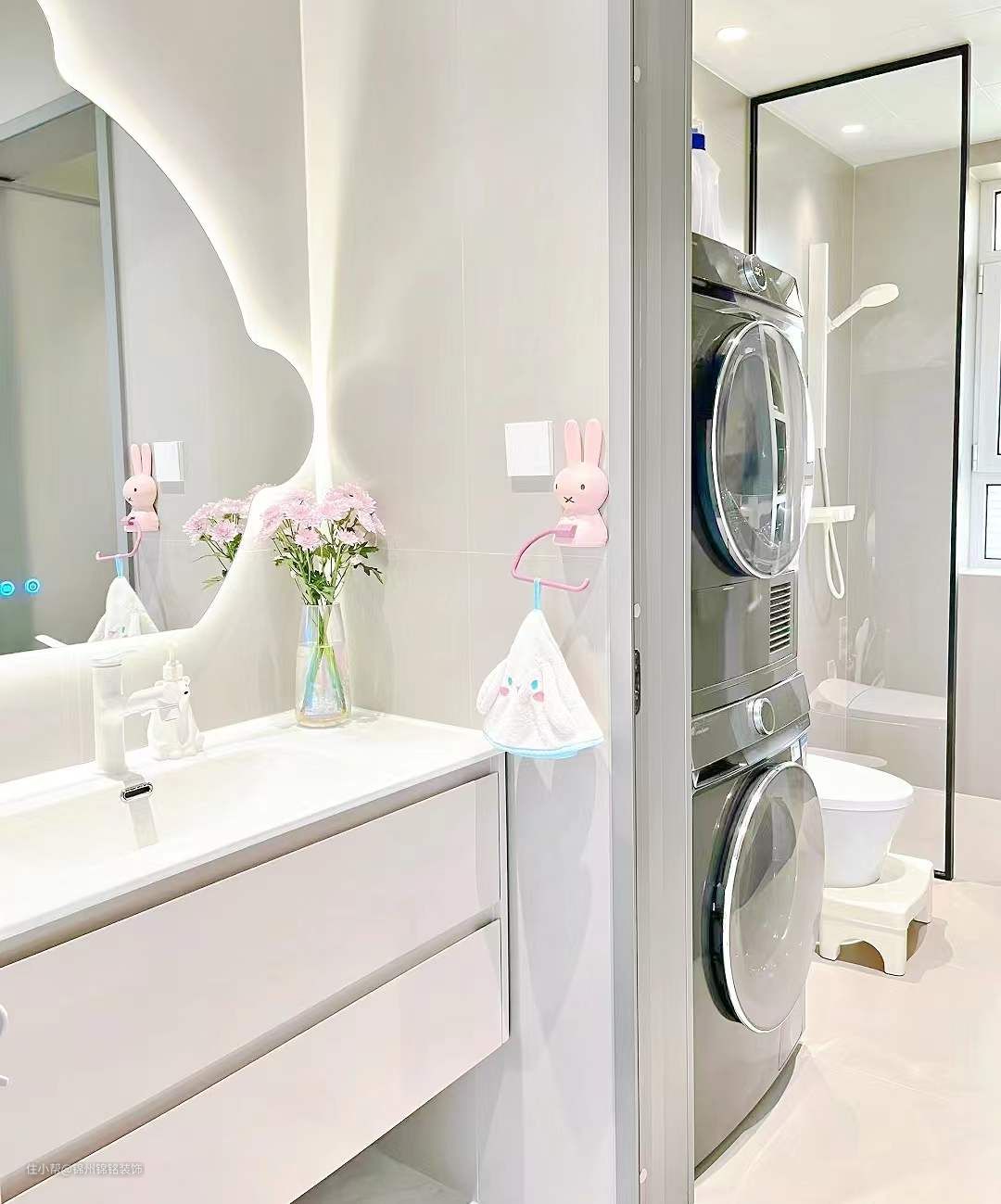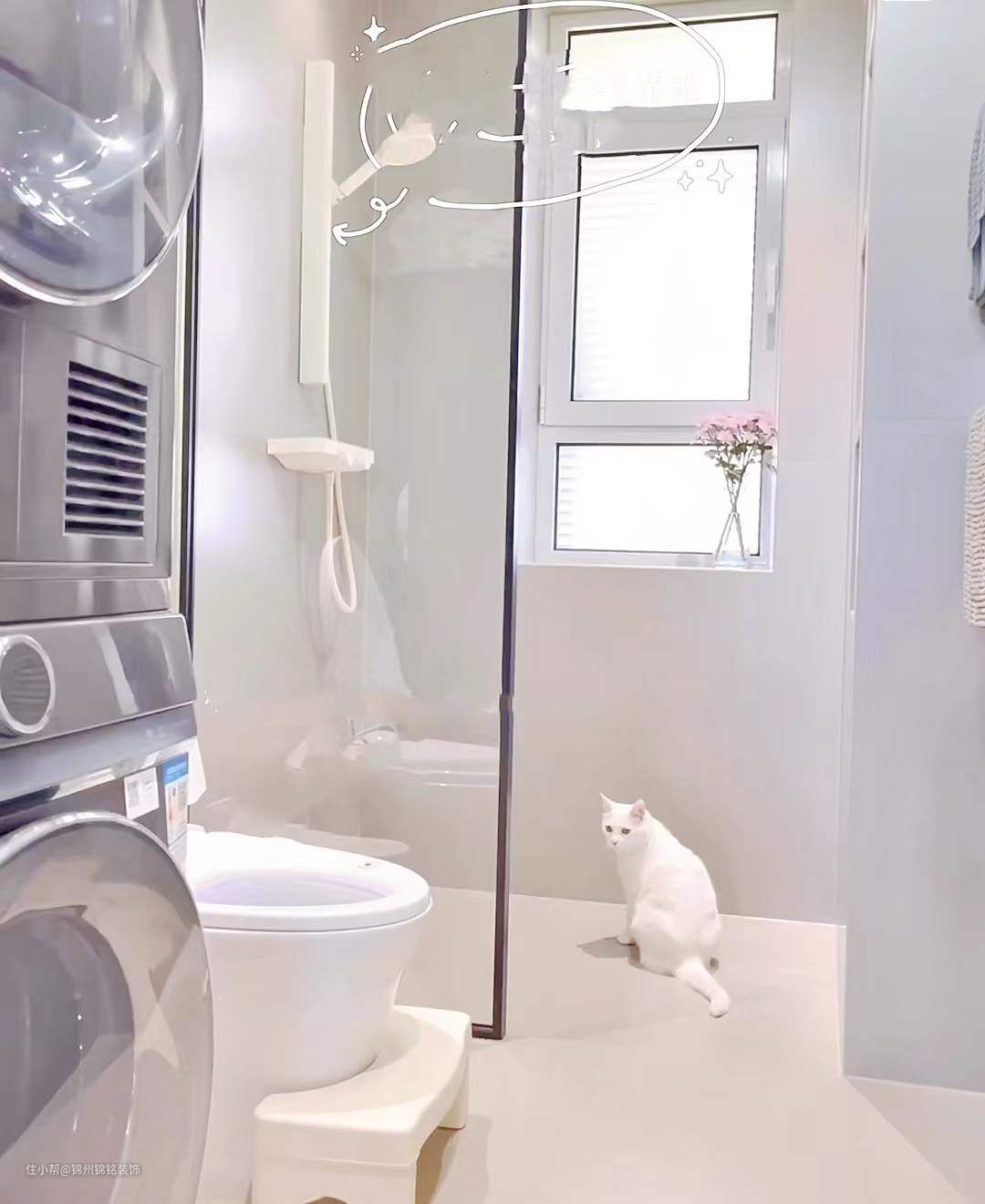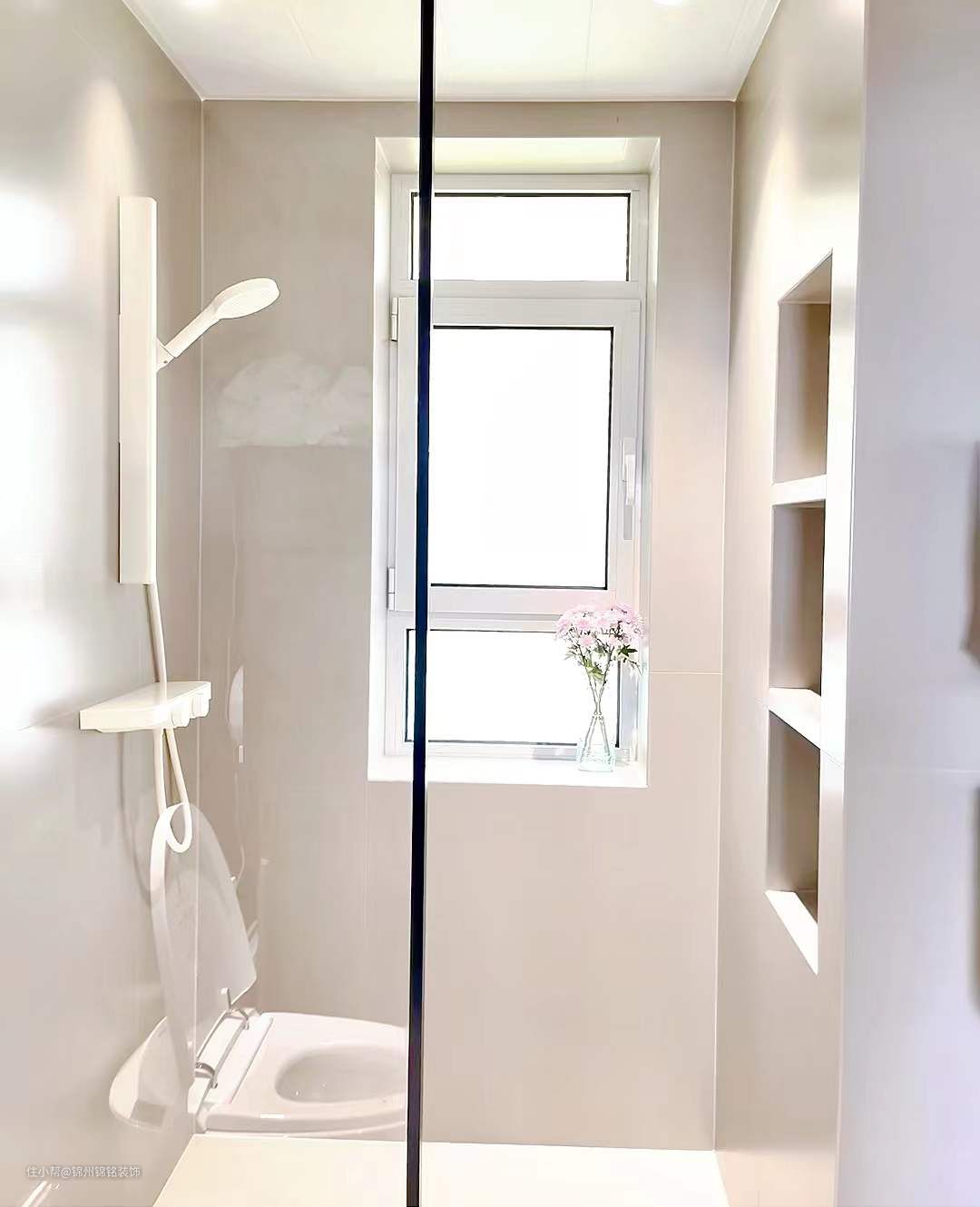 瓷砖是600*1200的柔光砖墙地通铺 颜色也很温柔,搭配同色系的美缝效果惊艳~吊顶干区是防水石膏板,湿区是纯白的铝扣板。卫生间门是超白油砂玻璃门,透光不透人。