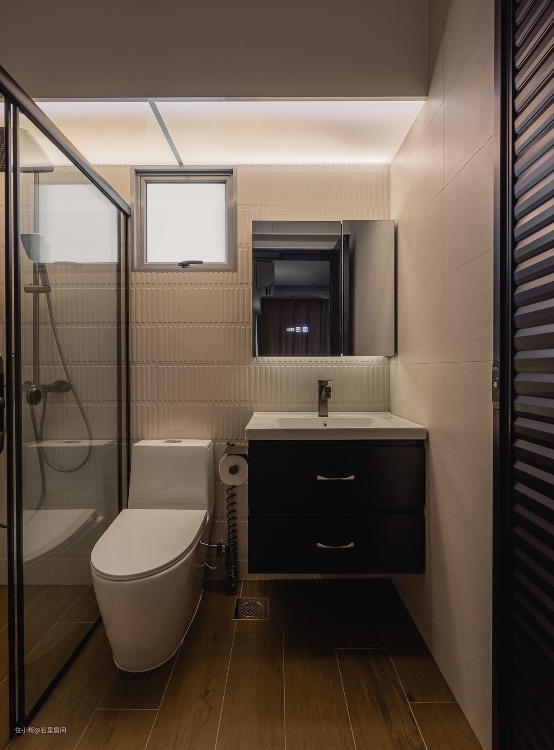 主卧内的卫生间是一个小的长方形空间,布局明了清晰,洗手台、马桶与淋浴间三区域相平行。