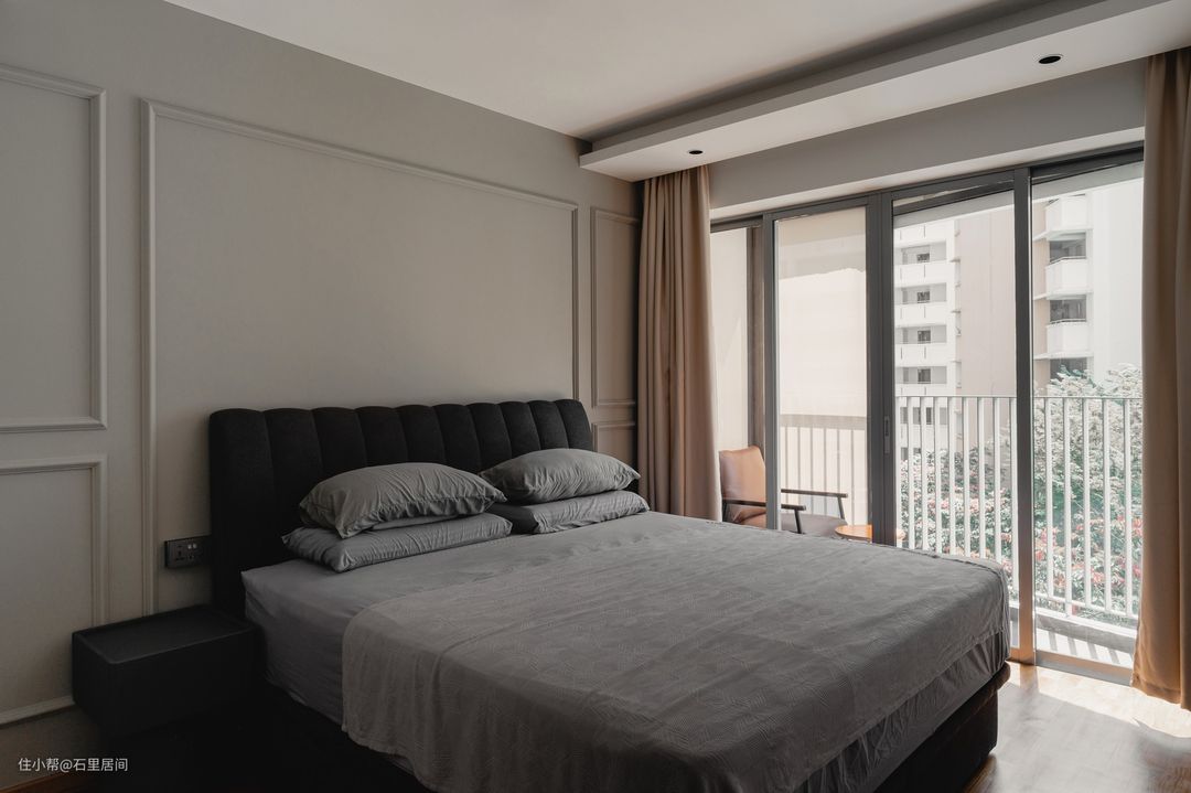 卧室的落地窗与阳台自然衔接,享受极佳的采光条件。安装墙裙增添了一丝优雅,有助于将任何普通的房间变成一个展示场所。