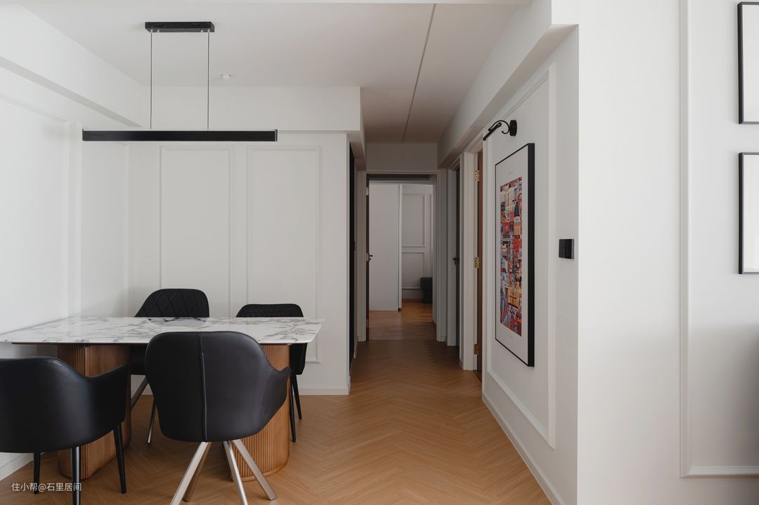 客厅与餐厅相邻,靠近走廊一侧的墙面上搭配了一张艺术画,丰富着纯色的墙面。画框上方安置一个壁灯,暖黄色的灯光增加温馨氛围。浅白色的餐桌台面搭配原木的桌角以支撑,在用餐区找到舒适与时尚的完美结合,让用餐时间更加愉快。