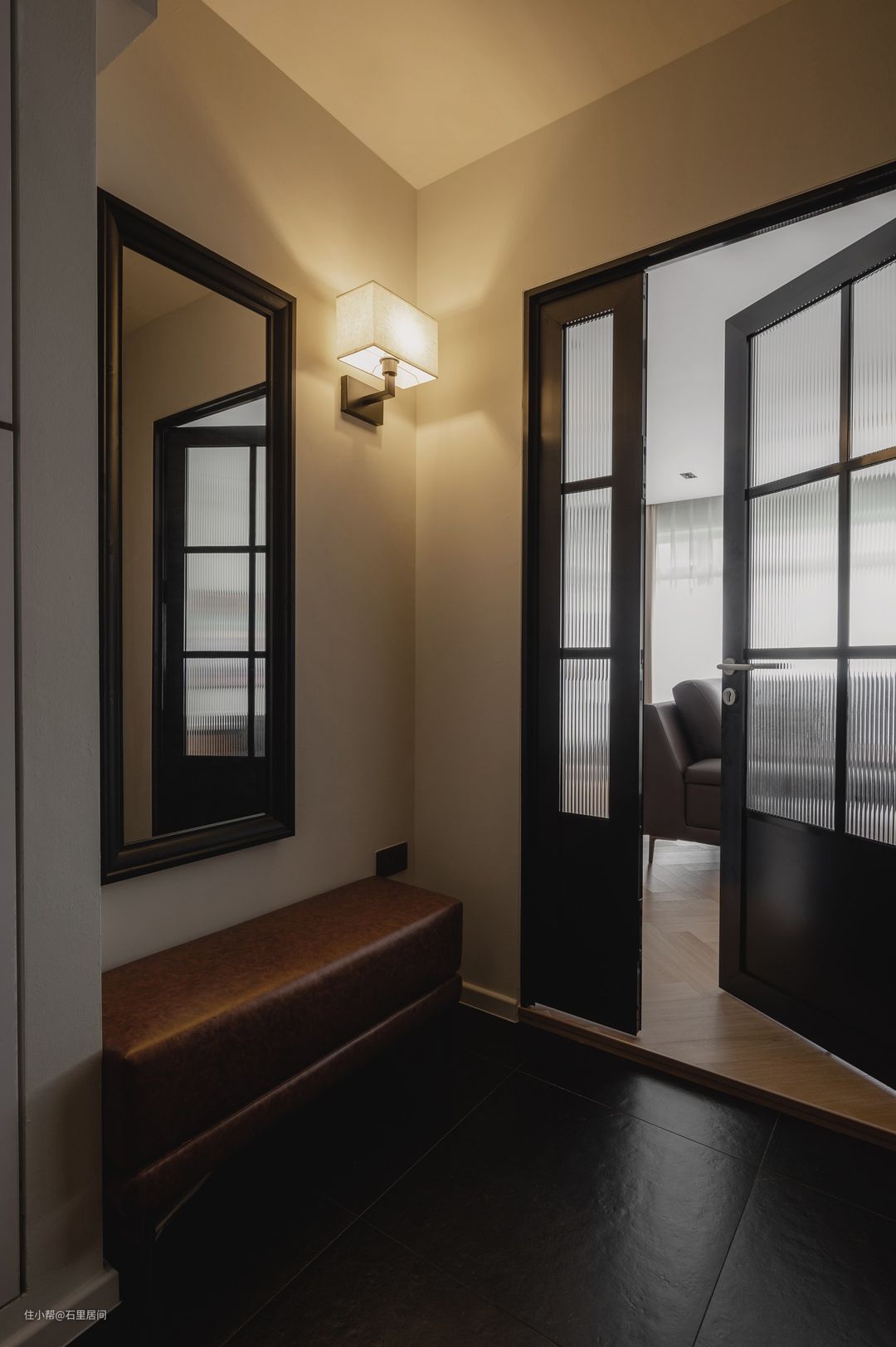 进门的玄关区域是一个方正的封闭式空间,完美承接了由室外到室内的转换与过渡。整体是沉稳的深色调,靠墙一侧设计了棕色皮质换鞋凳和一面黑框方镜,搭配上壁灯更显氛围感。