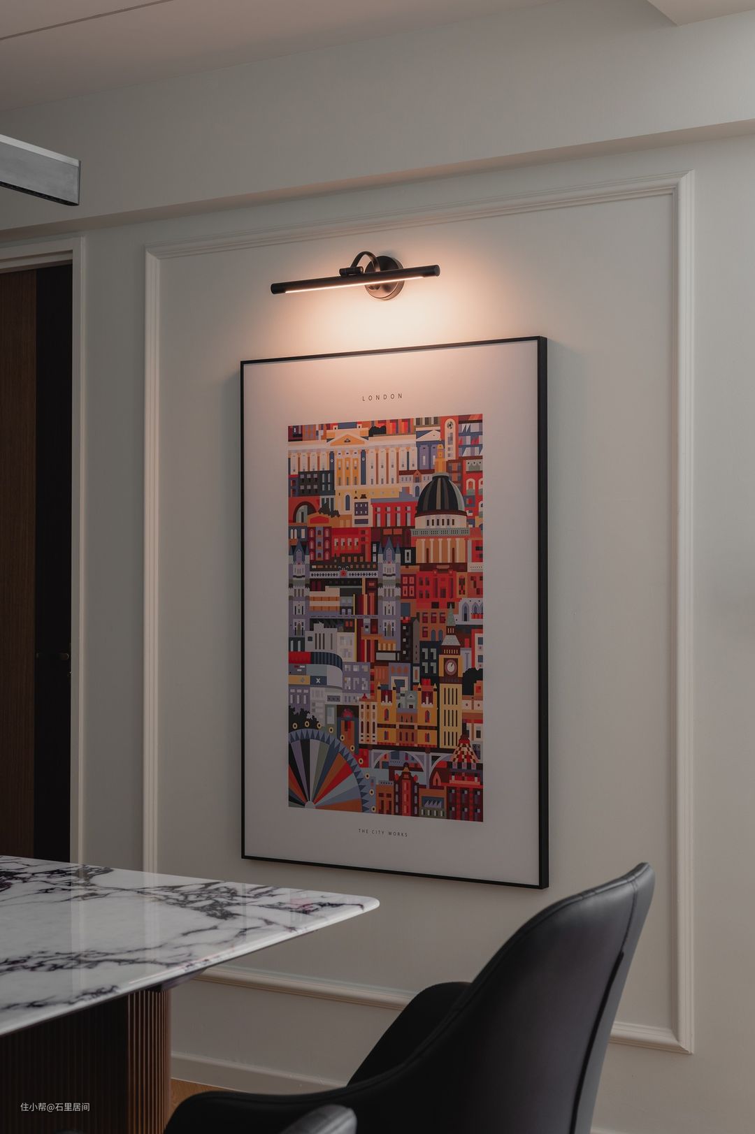 靠近走廊一侧的墙面上搭配了一张艺术画,丰富着纯色的墙面。画框上方安置一个壁灯,暖黄色的灯光增加温馨氛围。