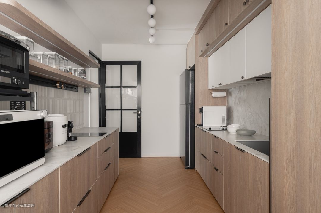 厨房定制的橱柜选择原木的柜身搭配白色系大理石的台面,既保证了外观上的协调,也满足日常的清洁实用性。橱柜分置在两侧墙壁,中间留出大量的动线空间,方便使用。