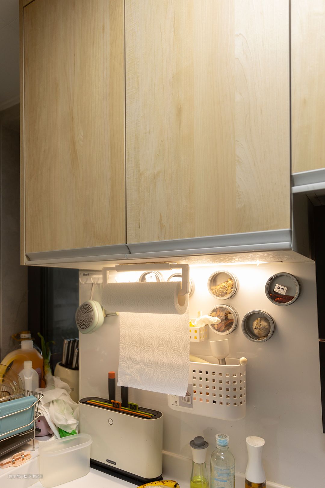 墙面贴的是珐琅板,一体无缝,防油污能力超强,炒菜时溅到油渍一抹就掉;珐琅板能够磁吸收纳也是一大优势,可以搭配各种小配件,使得调味品、抹布、刀具等厨房用品上墙收纳,节省台面空间。