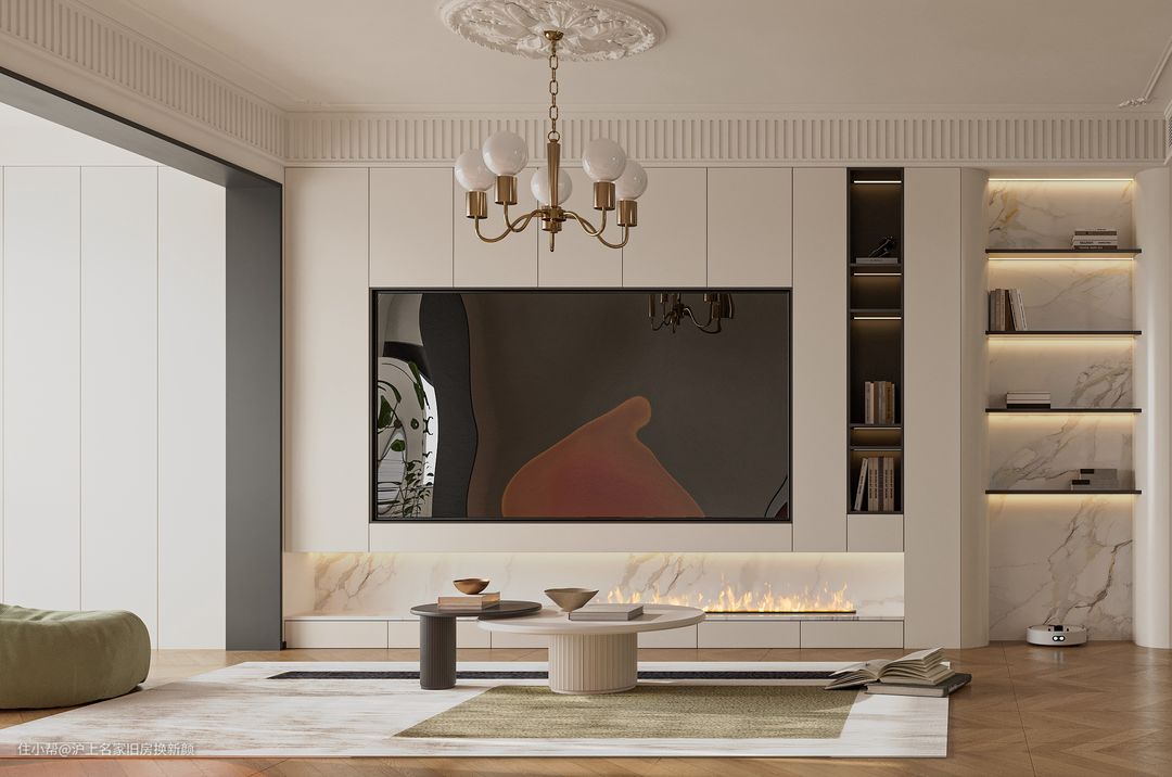 奶油色似乎成为了当下年轻人追捧的装修色调,色彩充满轻甜感。整个空间都充满了奶油色呈现出软糯的温柔质感,吊顶走一圈个性的格栅石膏线造型,法式花纹做点缀,透出优雅恬静的空间魅力。 干枯玫瑰色调的软包沙发,高级的莫兰迪色调从感官上给人心动的感觉,落地灯+落地挂画,高低不同,层次感极强;既有留白又让客厅丰富生机勃勃。 电视背景墙白色调满墙到顶收纳柜,无拉手的极简设计,高级耐看;内嵌电视显得整齐又不显得突兀,圆弧形连接内凹展示架,开放式置物架让整个空间更加通透,大理石背景,黑色隔板+灯带,高级大气氛围感扑面而来。