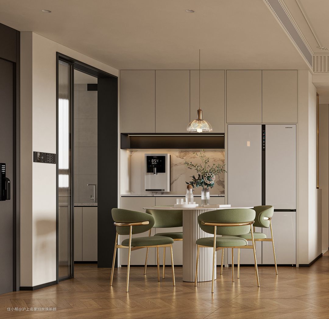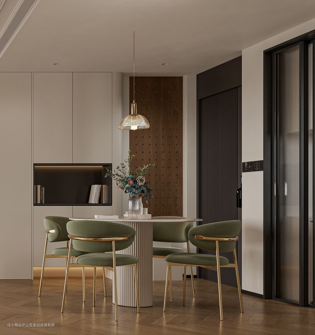 罗马柱圆形餐桌桌面四周圆滑,没有尖锐转角无惧磕绊,可以容纳更多人用餐,占地面积小反而增显空间,搭配绿色餐椅,质感十足,简洁利落中又多了份浪漫氛围感。