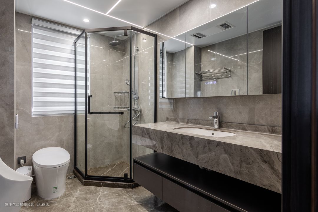 卫生间配色以黑白色调为主,浅灰色墙砖气质清冷高级,台下盆简洁实用,黑色大理石台面主打质感与颜值,智能镜与小型壁挂洗衣机小巧精致,兼具美观与实用性;借助于玻璃护门的安装,有效地将马桶区和洗浴区隔开,由此保障了优良的卫浴环境。