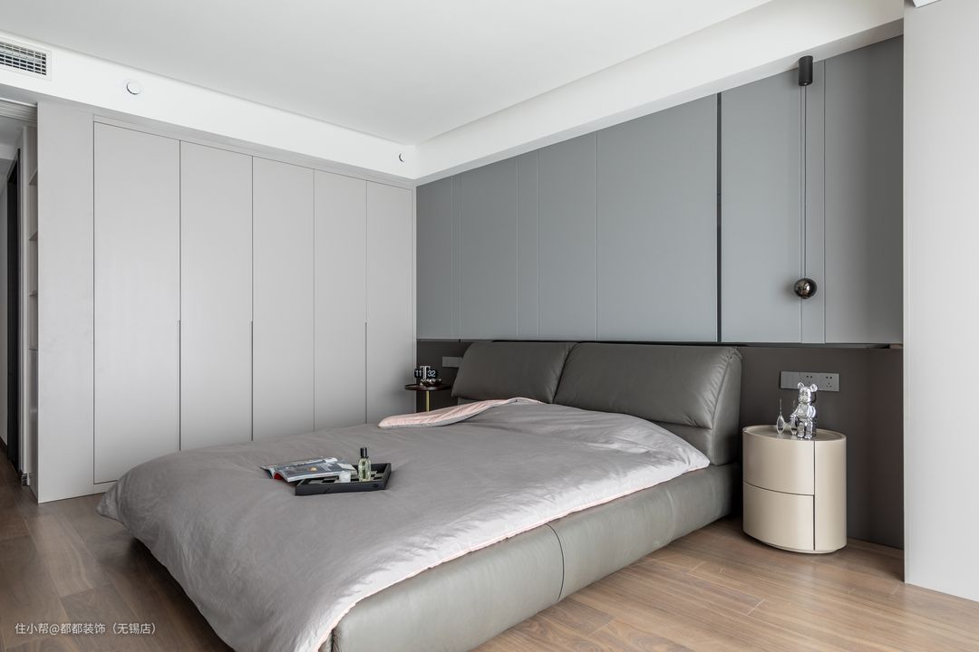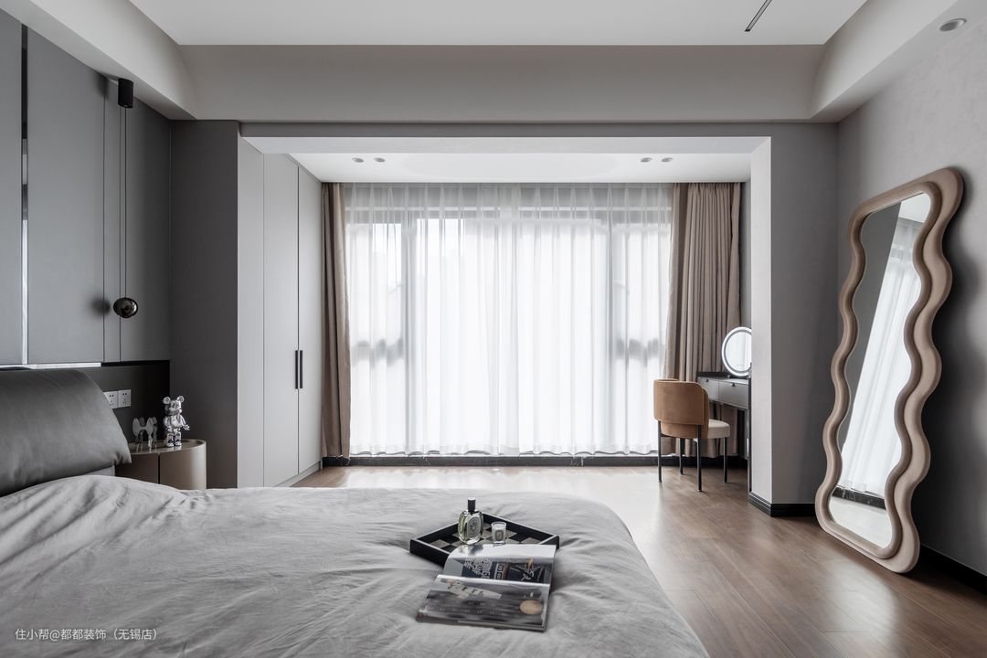 主卧更像是主人的一隅独立天地,床头板柔和的弧角温润亲和,背景墙的灰色橡木纹理似在雕刻时间的肌理,令空间产生熨帖身心的舒适感。 床尾靠墙的放置的简约书桌,纤薄时尚的造型诠释了简约即是美的当下审美风潮,搭配莫兰咖色的双层弧面环腰化妆椅,对品质的描摹,藏于家中每一个细节中。